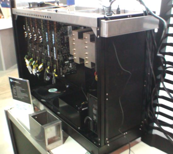 Silverstone al Computex 2011 presenta il primo case o per meglio dire un concept case in grado di ospitare ben 6 schede dual slot indifferentemente se Nvidia o Amd, di chi stiamo parlando; del Silverstone Temjin TJ12.Silverstone come accennato ad inizio news ha presentato al Computex 2011 di Taipei un nuovo concept case denominato Temjin TJ12 in grado di ospitare 6 schede, si avete capito bene, dual slot che potranno essere sia delle GeForce sia delle Radeon. Nella configurazione presentata al Computex di Taipei erano presenti quattro GTX480 e due GTX580. Possiamo ammirare il tutto in questa foto: