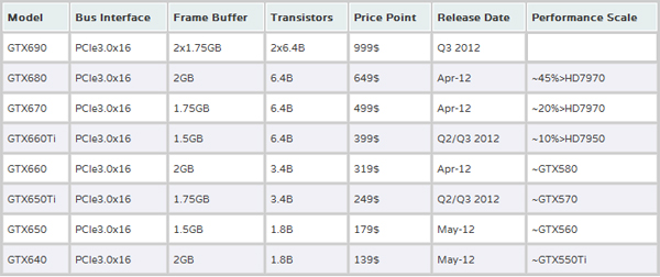 La top di gamma, GTX 680, al prezzo di 649 Dollari sarà circa il 45% più performante della HD 7970.