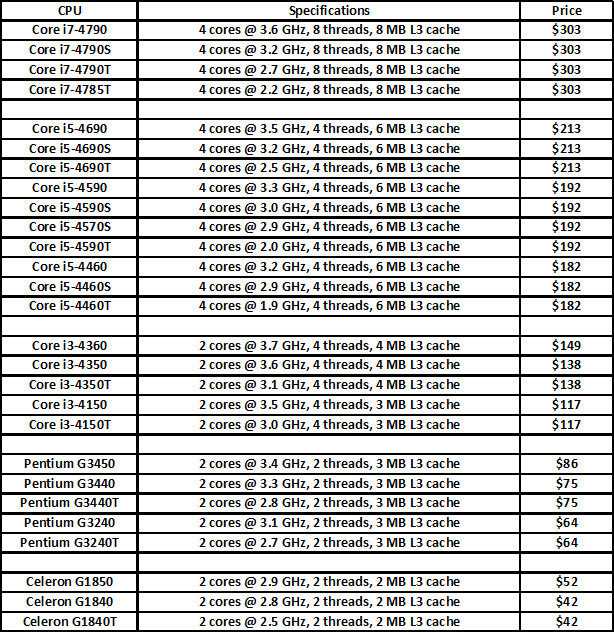 La lista delle 44 CPU Intel è stata suddivisiva in due tabelle da TechPowerUP, di cui 27 fanno parte del mercato desktop e le restanti 17 per quello mobile. L'architettura è ancora la stessa di Haswell e a 22 nm, mentre le specifiche tecniche variano di un circa 100 MHz sulla frequenza per i rispettivi prodotti che vengono sostituiti, o meglio dire aggiornati.