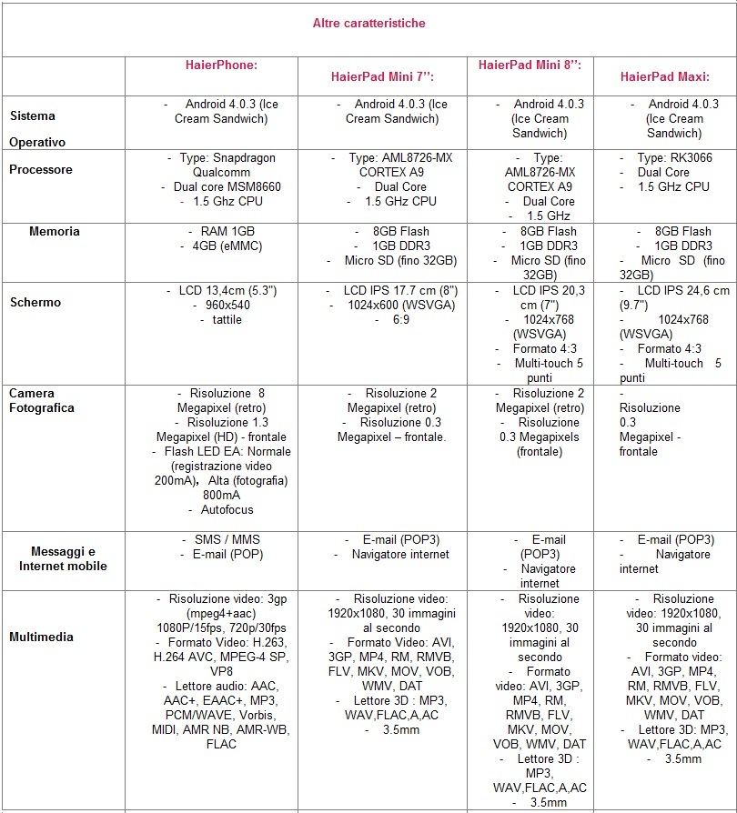 In occasione del CES 2013, il numero 1 al mondo nel  settore dei grandi elettrodomestici* presenta una vasta gamma di tablet con  il nome di "HaierPad". Questa gamma sarà dotata di potenti processori  e Bluetooth per consentire ai dispositivi elettronici di connettersi e  scambiarsi dati fra loro. I nuovi "HaierPad" si riconoscono  dall’elegante rifinitura metallica e dagli schermi IPS in formato 4/3 o  16/9. Gli HaierPad sono disponibili in 5.3'' (13,4 cm), 7'' (17,7 cm), 8''  (20,3 cm) e 9,7'' (24,6 cm).