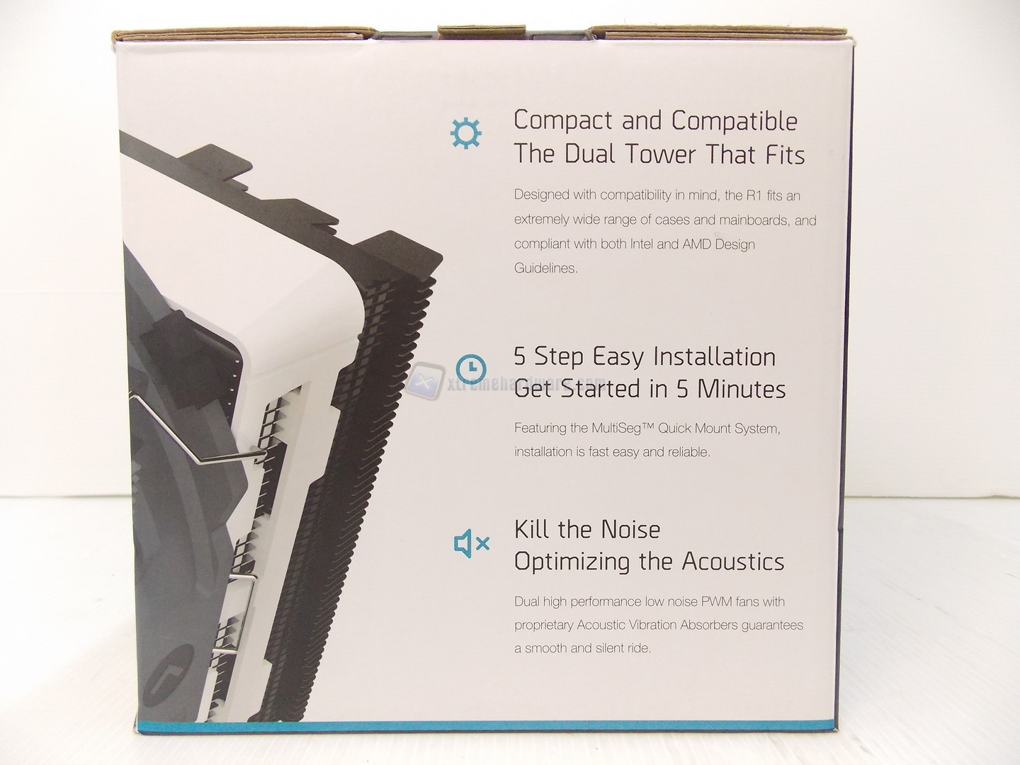 La confezione esterna, identica al modello R1 Ultimate, è molto curata, si caratterizza per un elevatissimo numero di informazioni. L'imballo è eccellente, al punto che siamo rimasti addirittura stupiti per alcune finezze tra cui la scatola delle componenti separata dal resto ed anche delle carte plastificate con cui registrare sia il dissipatore.