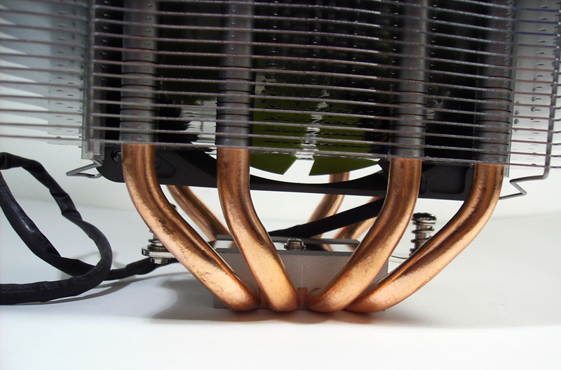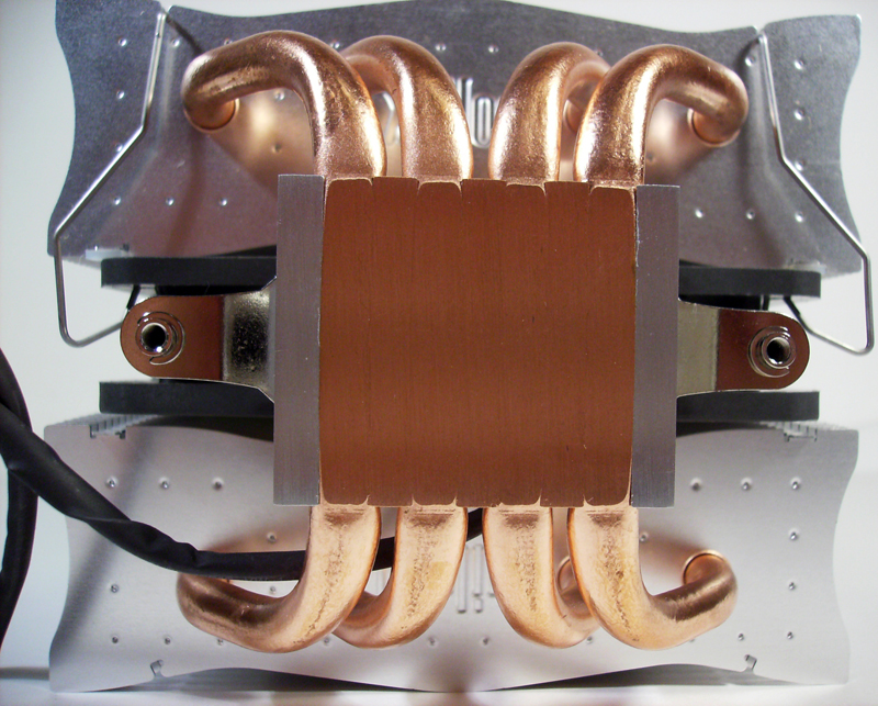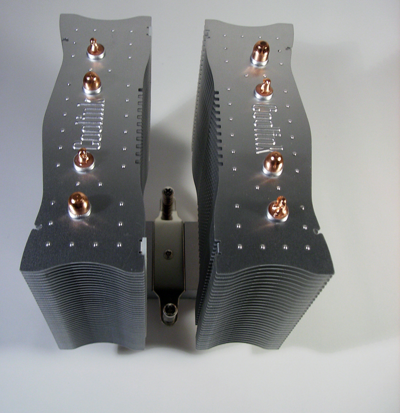 Il dissipatore é dotato di  4 heatpipes di rame da 8mm e, grazie alle sue 70 alette e ad una superficie di 7500cm2, si riescono ad ottenere temperature decisamente basse. Anche la base è costruita in rame ma non presenta una lappatura a specchio.