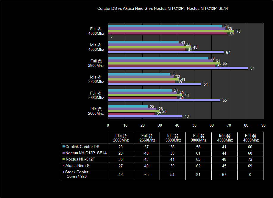 Andiamo ad analizzare in primis le temperature ottenute con il Core i7. Notiamo che il Corator DS ha la meglio su tutti e 4 i dissipatori presenti nella comparativa. Il fatto che sia double tower e che utilizzi una pasta alla ceramica aiuta molto e forse proprio questi due fattori hanno contribuito al raggiungimento di tali temperature. Ovviamente i test sono stati effettuati con la ventola a pieno regime. Con la ventola al minimo a 4Ghz si raggiungono invece temperature superiori ai 72°C. A pieno regime la ventola è piuttosto rumorosa e a lungo andare può risultare un po’ fastidiosa. Dal grafico possiamo notare chedal rispetto al nuovo modello della Noctua il Coolink riesce a guadagnare qualche °C, ma ciò vale veramente la pena ? dire Bisogna infatti notare che il Noctua vanta di una qualità costruttiva migliore, è mono radiatore e soprattutto è estremamente silenzioso, mentre il Corator Ds, anche se di buona fattura, riesce ad ottenere buone temperature solo a scapito della silenziosità. Teniamo a precisare che il Corator DS è stato l’unico dissipatore di questa recensione a essere double tower e la sua ventola si è dimostrata, anche se di poco, la più rumorosa.
