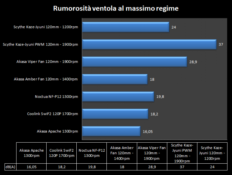 Emerge che prestazionalmente la Kaze-Jyuni PWM non ha rivali, grazie ai suoi 110CFM si porta in capo alla classica, risultando la ventola più performante fra quelle analizzate finora, ma ovviamente la sua rumorosità risulta essere la più elevata di tutti, infatti tocca quota 37db(A) e risulta udibile anche dentro a un case.