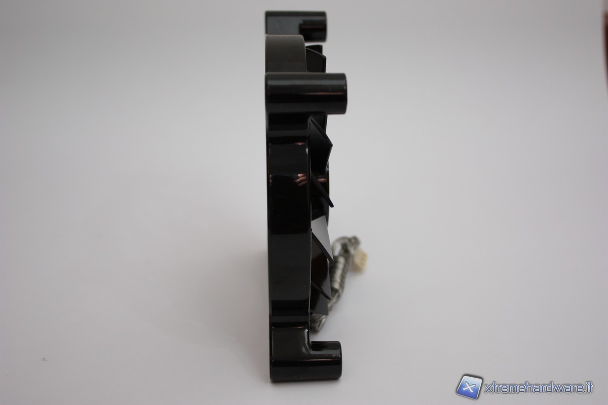 Come potete vedere dall'immagine superiore, la presenza del cupolino fa si che l'aria scivoli più facilmente a ridosso delle pale; inoltre, la particolare forma di quest'ultime, garantisce un flusso extra che entra lateralmente senza provocare turbolenze. L'aumento a 16 pale porta al massimo l'area totale della ventola, garantendo un flusso costante e silenzioso a giri bassi.