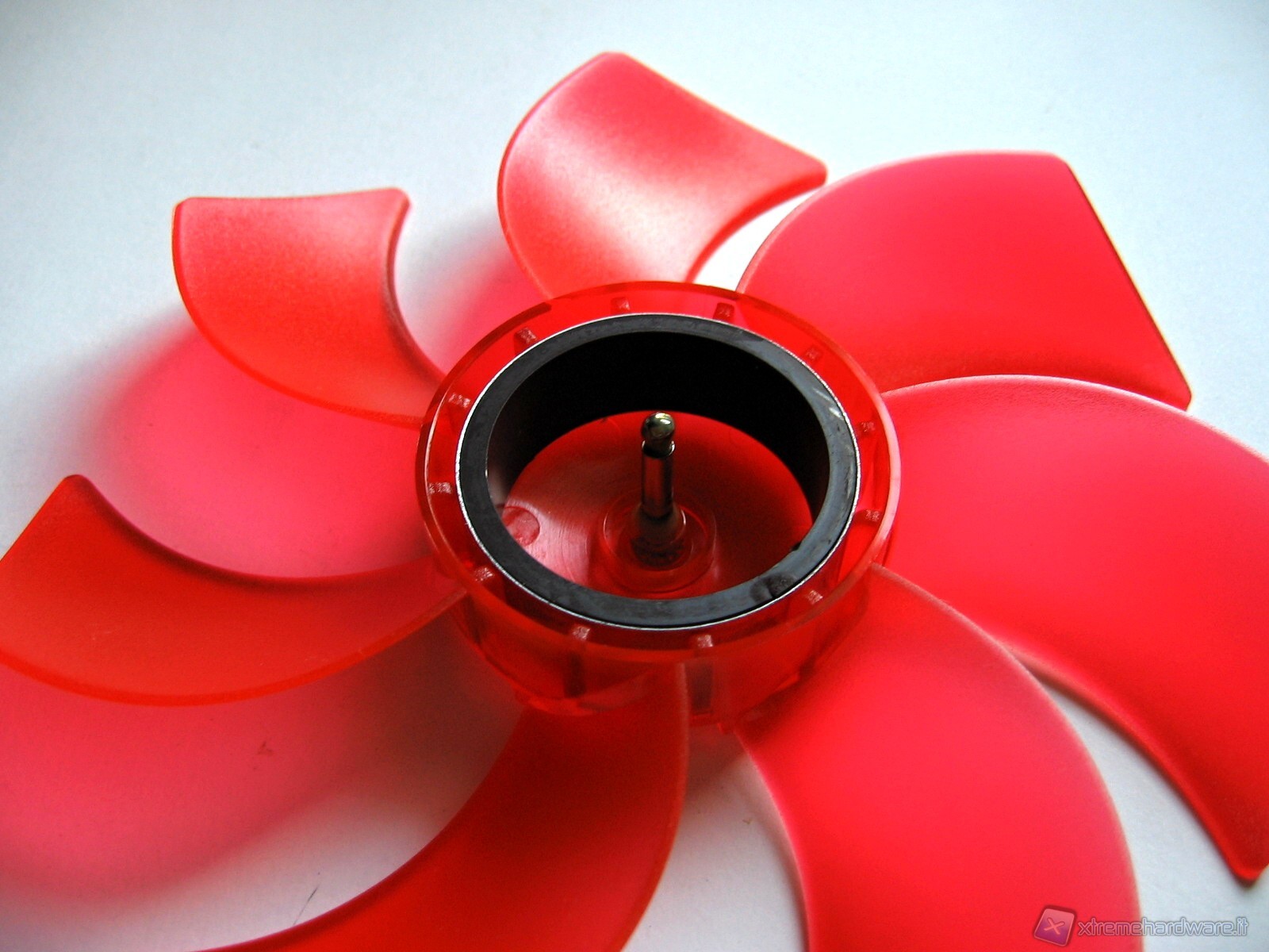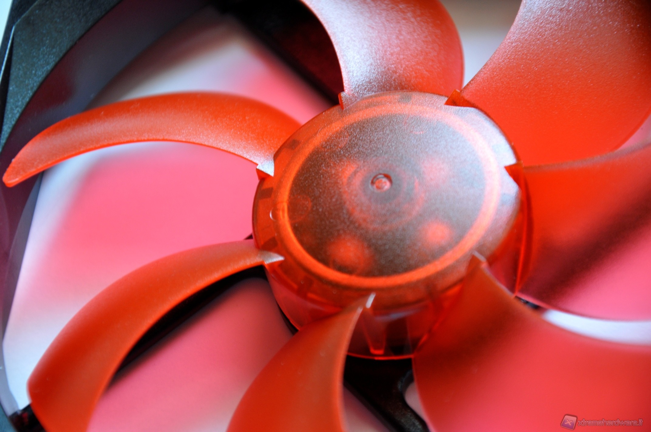 Invece, come potete vedere di seguito, la girante è leggermente trasparente, di colore rosso e caratterizzata da una superficie porosa. E’ dotata di 7 pale, la cui linea di taglio nonché l’angolo, e più in generale il profilo di ogni pala, sono stati progettati per facilitare l’aerodinamica del flusso ed in questo modo rendere la ventola più performante e silenziosa. Passiamo invece al sistema di rotazione che è quello che permette di fare la differenza in ciascuna ventola. Phobya nel progettare la G-Silent si è posta come obiettivo la silenziosità d’esercizio. Ed è su questo punto che ha lavorato riuscendo a realizzare una ventola silenziosa ma anche prestante, con un flusso d’aria generato di circa 90 mᶟ/h. Ottima anche la possibilità di estrarre (staccare) la girante dal suo vano, per poter eseguire una pulizia rapida e profonda, eventualmente con acqua corrente, senza dover smontare la struttura della ventola dal case o dal radiatore su cui è stata montata. Di seguito due particolari rispettivamente della girante e del corpo centrale.