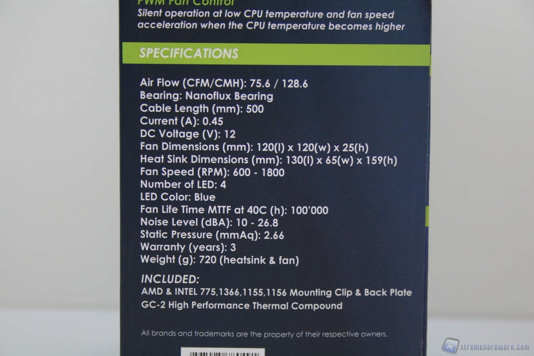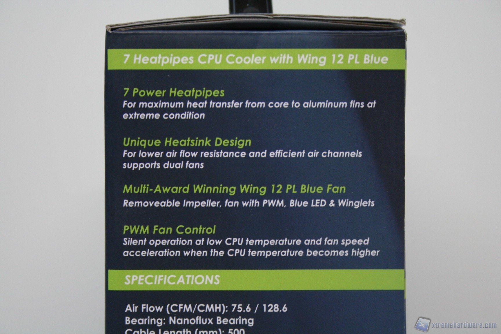 La confezione esterna è di pregevole fattura, ci sono numerose informazioni dettagliate e si presenta con una colorazione blu scura di fondo.  Il layout esterno è di buona qualità, viceversa non siamo rimasti molto convinti dall’imballo interno della scatola, che essendo di plastica, in caso di urti accidentali potrebbe non fornire sufficiente protezione. Aprendo la confezione notiamo una scatola bianca sopra il dissipatore principale, davanti al quale è riposta l’unica ventola in dotazione.