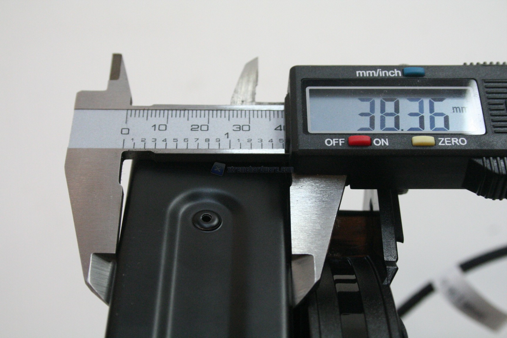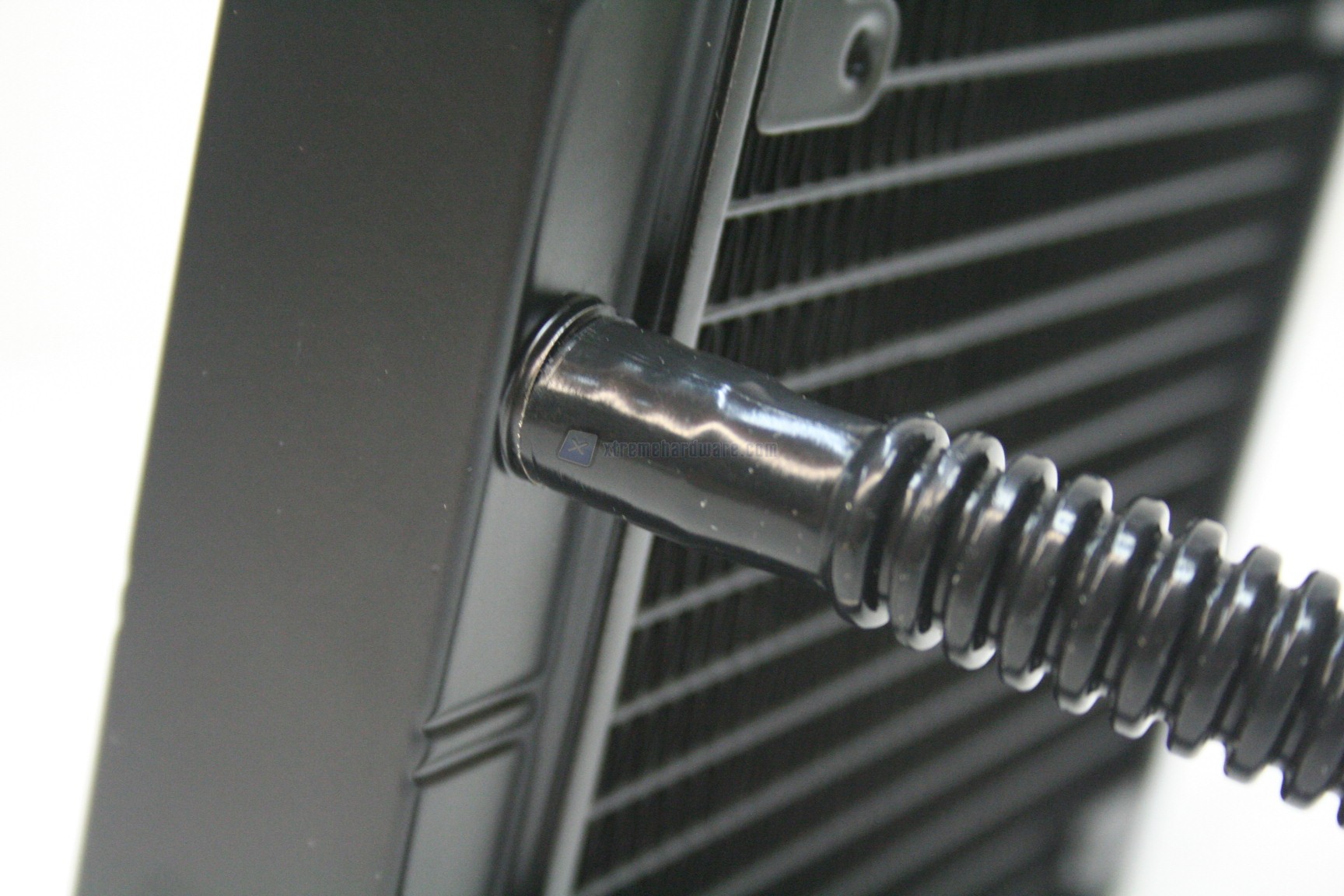 Le tubazioni sono di una tipologia simile ai vecchi modelli Corsair, ma con una sostanziale differenza per quanto concerne il diametro interno, in questo caso ben maggiore. La lunghezza non è eccessiva ma la rigidità è medio/alta, ragion per cui sarebbe consigliabile montarlo nel classico posizionamento laterale in una conformazione ATX, ovvero con il radiatore a contatto della ventola in espulsione del case. Il diametro dei tubi, reale, è leggermente inferiore a quello che potete osservare direttamente all’esterno, anche se non è chiaro se sia presente una tubazione interna che non permetta quindi al fluido interno di sbattere contro le insenature radiali del tubo stesso. Sarebbe necessario segarlo in due, e si comprende chiaramente che ciò non è ovviamente possibile ai fini della recensione. Facciamo presente che c’è un meccanismo di inserimento dell’acqua nel radiatore, tramite un tubo collettore svitabile. Qualora fosse aperto però la garanzia verrebbe invalidata e data la caratteristica di questi modelli che permette la mancanza di una periodica manutenzione, è assolutamente sconsigliabile aprirla. E’ possibile che serva per fini di riparazione o test pre-vendita o assemblaggio. In sostanza quindi siamo dinanzi ad una soluzione che si differenzia dalle precedenti, certamente più economica delle soluzioni Eisberg, ma sempre di ottima qualità. Qualche fotografia dello spessore con le ventole: