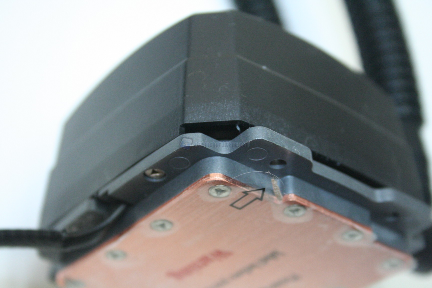 La base non presenta della pasta termica preapplicata fortunatamente e si differenzia molto dal modello Seidon 120XL. La forma quadrata permette di aumentare la superficie di contatto con IHS molto grandi, ed al contempo permette un assemblaggio radicalmente diverso dal precedente, per via della differente tipologia del sistema di blocco basale. Questa diversità ha un forte punto a favore, il montaggio: non è necessario ruotare il dissipatore, diversamente da quanto fatto in precedenza con i modelli simil-Asetek, ragion per cui l'applicazione della pasta termica non sarà sconvolta dal movimento rotatorio. Il contatto è eccellente, come il sistema di montaggio dei fermi laterali, inseriti in una fessura e poi fissati con delle viti.