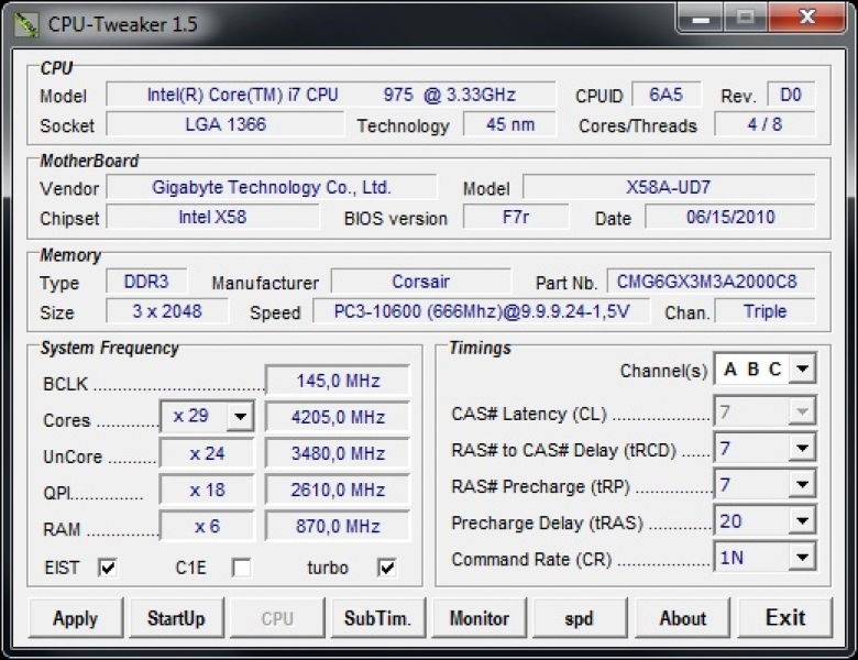 Al fine di uniformare e rendere quanto più attendibili i risultati, i test sono stati condotti con una temperatura ambientale di 21° C. La CPU, un i7 975EE, è stata portata a una frequenza di overclock di 4205 Mhz con 1,4V di vcore, per un consumo lineare sotto carico di circa 250 Watt. Per raggiungere questo carico è stato sollecitato anche il controller della memoria integrato nel processore. Le RAM usate per il test, delle Corsair Dominator GT 2000, sono state impostate a una frequenza di 1740 con timings CL7-7-7-20 1T.