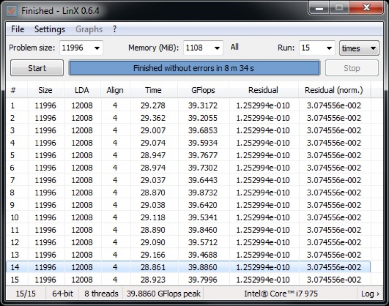 Come programma di test è stato usato uno dei più famosi programmi di torture test, LinX. Esso si basa sulle librerie Linpack e permette di stressare la CPU per verificarne la stabilità di funzionamento, portando il carico operativo al 100% su tutti i core. La sua efficienza è dimostrata dal fatto che è molto difficile completare con successo i cicli impostati. A titolo di paragone rispetto a Prime95 le temperature massime raggiunte da LinX sono superiori di 3° – 5°. Le temperature sono state misurate mediando quelle rilevate sui quattro core attraverso il software RealTemp.