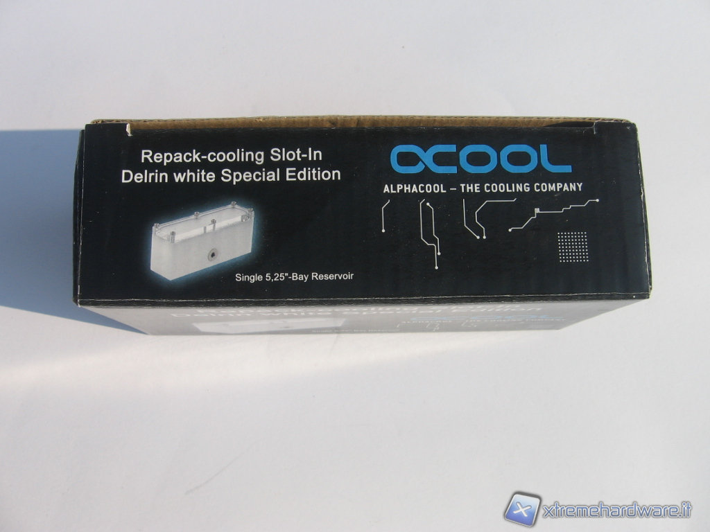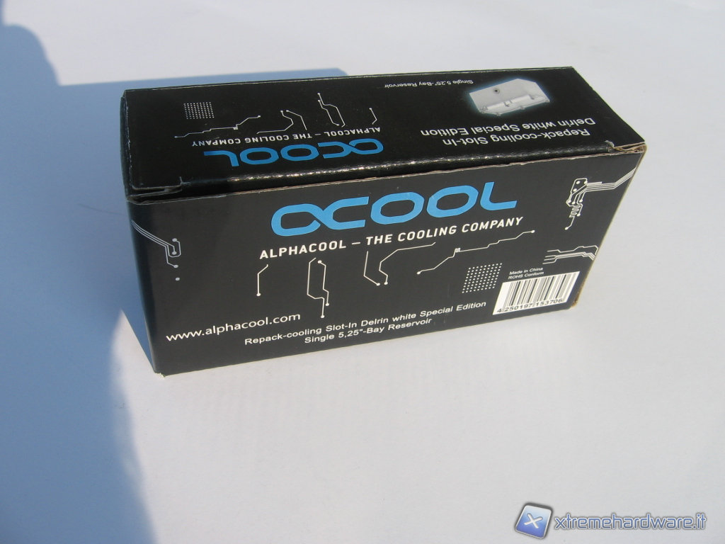 Il prodotto si presenta in una confezione nera, il marchio dell’azienda è ben visibile di colore azzurro e centrale. La frase presente sotto il marchio dell’azienda, “The Cooling Company” rende ben chiara la missione e l’obbiettivo di Alphacool: il campo del raffreddamento per PC.