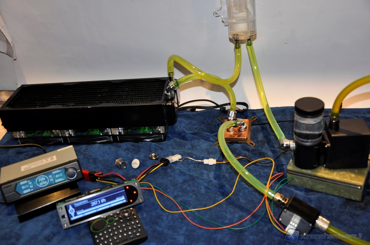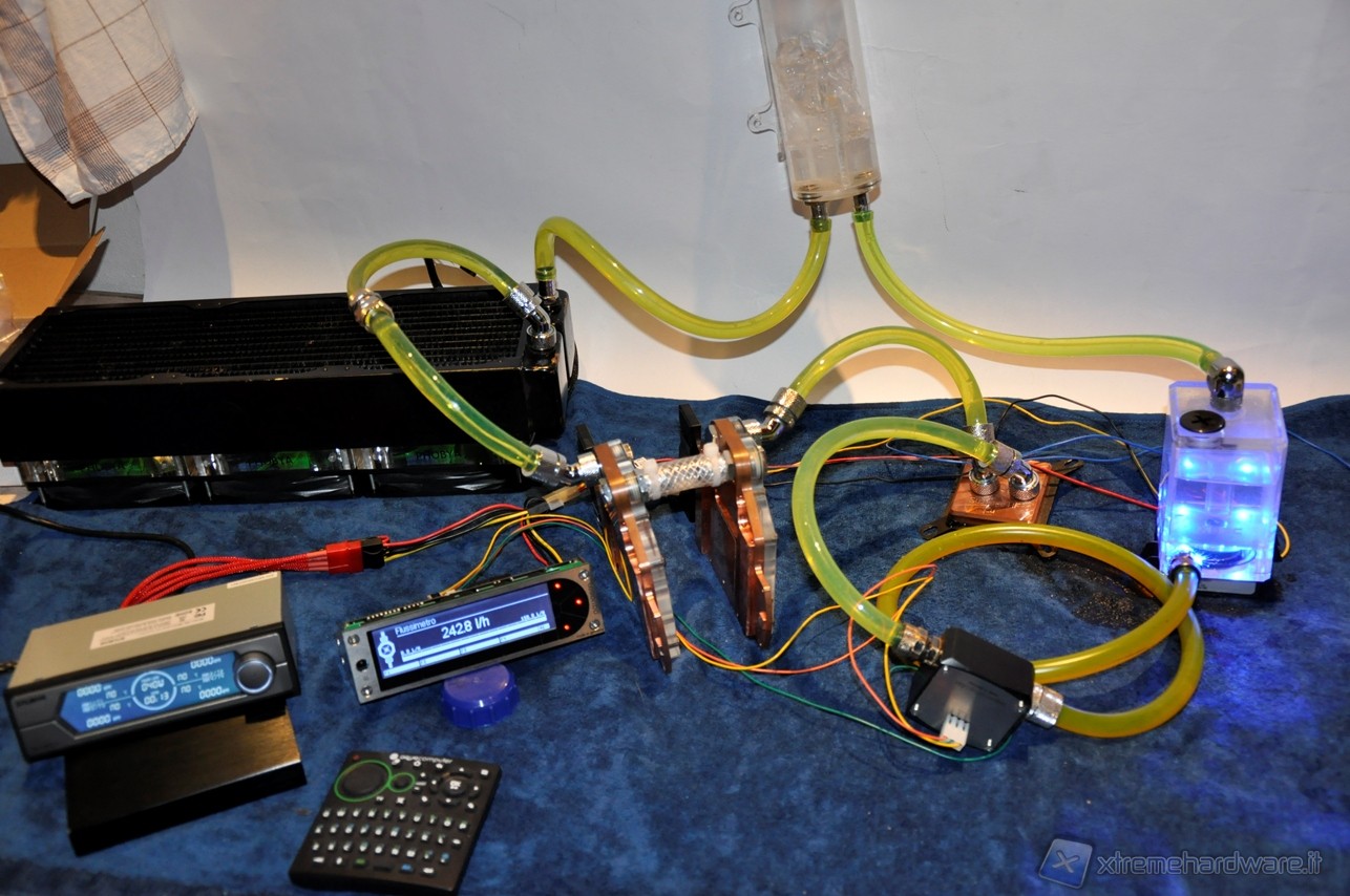 La Alphacool VPP655 corredata di HF Top Plexi D5 si è posizionata nella fascia media, battendo la Phobya DC400 ma non la Swiftech MCP355, avvantaggiata dal TOP Reservoir della XSPC. Abbiamo quindi aggiunto al circuito altri 2 waterblock per sovraccaricare ulteriormente il lavoro delle pompe e vedere come scalano in prestazioni. Lo schema è il seguente: