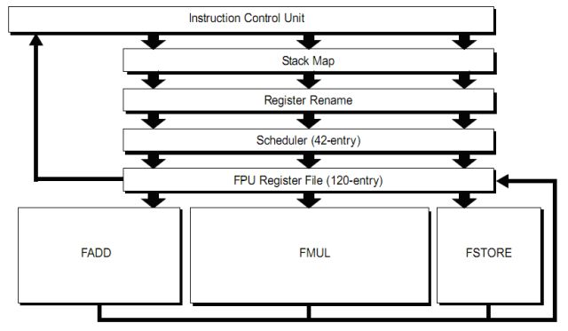 The FPU consists of a stack renaming unit (because x87 does not work with registers but with a stack architecture of 8 elements, inherited from the first external x87 FPU), which allows translating stack access to an 8 registers access, a conventional register renaming unit, a scheduler, a register file, which contains the physical registers and execution units each capable of processing up to 128 bits per clock cycle. The figure shows a block diagram for the flow of data of the FPU.