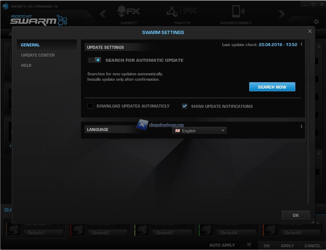 Il software di gestione ROCCAT Swarm si conclude con un Menù per la gestione e controllo dei dispositivi connessi e compatibili e la relativa disponibilità di aggiornamenti. Potremo controllare anche tutti gli eventuali Change-Log per i nuovi aggiornamenti. Viene messo a disposizione anche un Recovery Tool in caso di problemi dovuti ad un nuovo aggiornamento o malfunzionamento della periferica. Potremo inoltre cambiare lingua di visualizzazione.