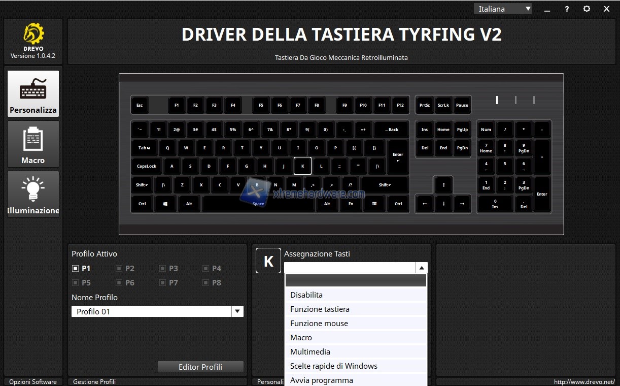A sinistra troviamo solo 3 Menù principali che sono ‘’Personalizza’’, ‘’Macro’’ e ‘’Illuminazione’’. Nel Menù ‘’Personalizza’’ troviamo una tastiera Full Layout ma giustamente potremo modificare solo i tasti relativi il modello in questione TKL seppur il software da possibilità di impostare e personalizzare i restanti del tastierino numerico. La personalizzazione dei tasti prevede alcune funzioni come la riassegnazione del tasto con funzioni multimediali, riassegnazione di un tasto con un altro, funzione mouse, Macro, avvia di un software e cosi via. Le possibilità di configurazione a nostra disposizione sono valide.