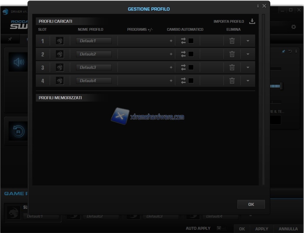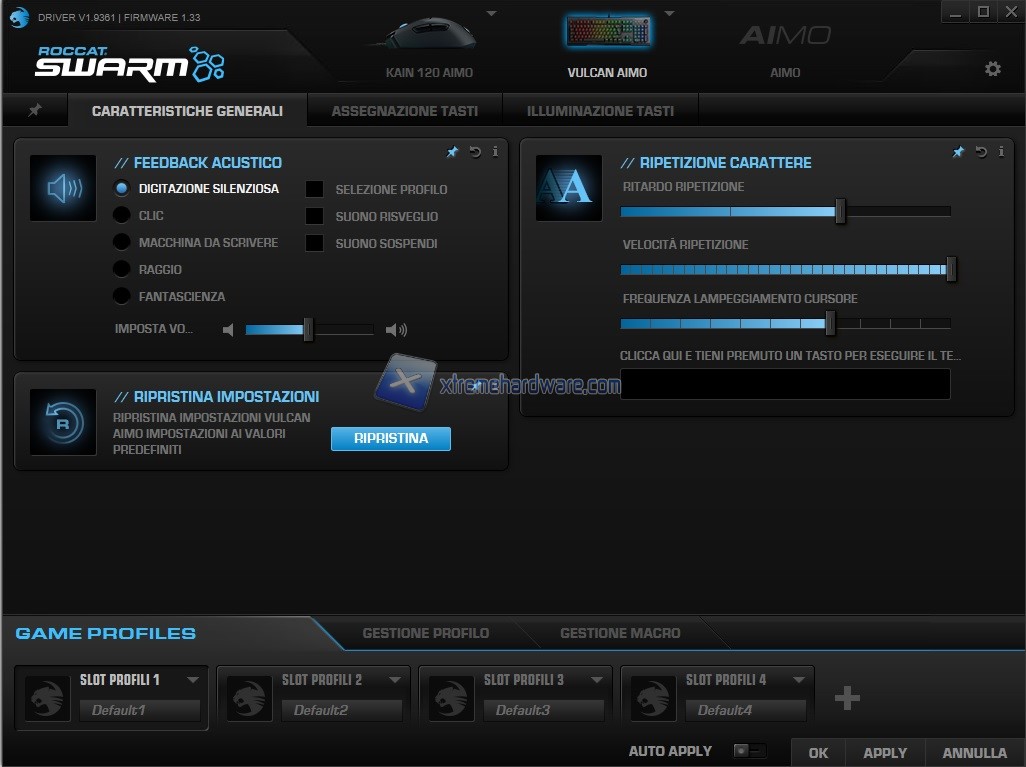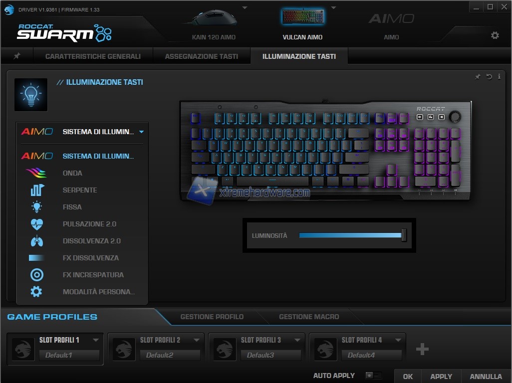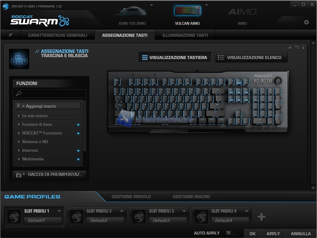 A seconda della periferica collegata il software ROCCAT Swarm, così come gli altri software di gestione, metterà a disposizione diverse impostazioni di personalizzazione. Vediamole assieme con gli screen a seguire. Ricordo che anche la Vulcan 121 AIMO è dotata di una memoria On-board con cui potremo creare eventualmente i profili di nostro interesse e a seguire disinstallare il software se vi da noia o non lo volete installato.