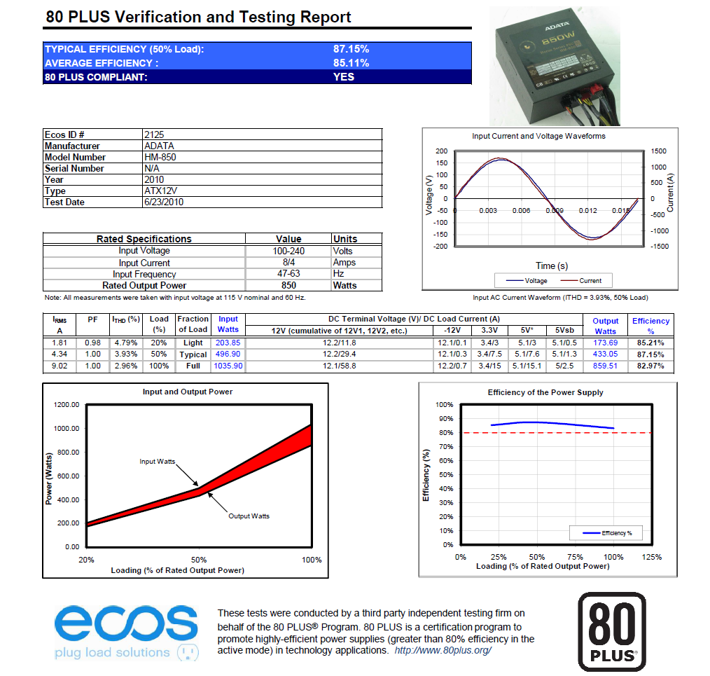 Il nuovo A-Data HM-850 è riuscito ad ottenere la prestigiosa certificazione 80 Plus Bronze, garantendo un’efficienza superiore all’85% che arriva all’85% al 50% di carico, fino a scendere a quasi 83% in full-load. L’efficienza media di questo prodotto è dell’85.10%.