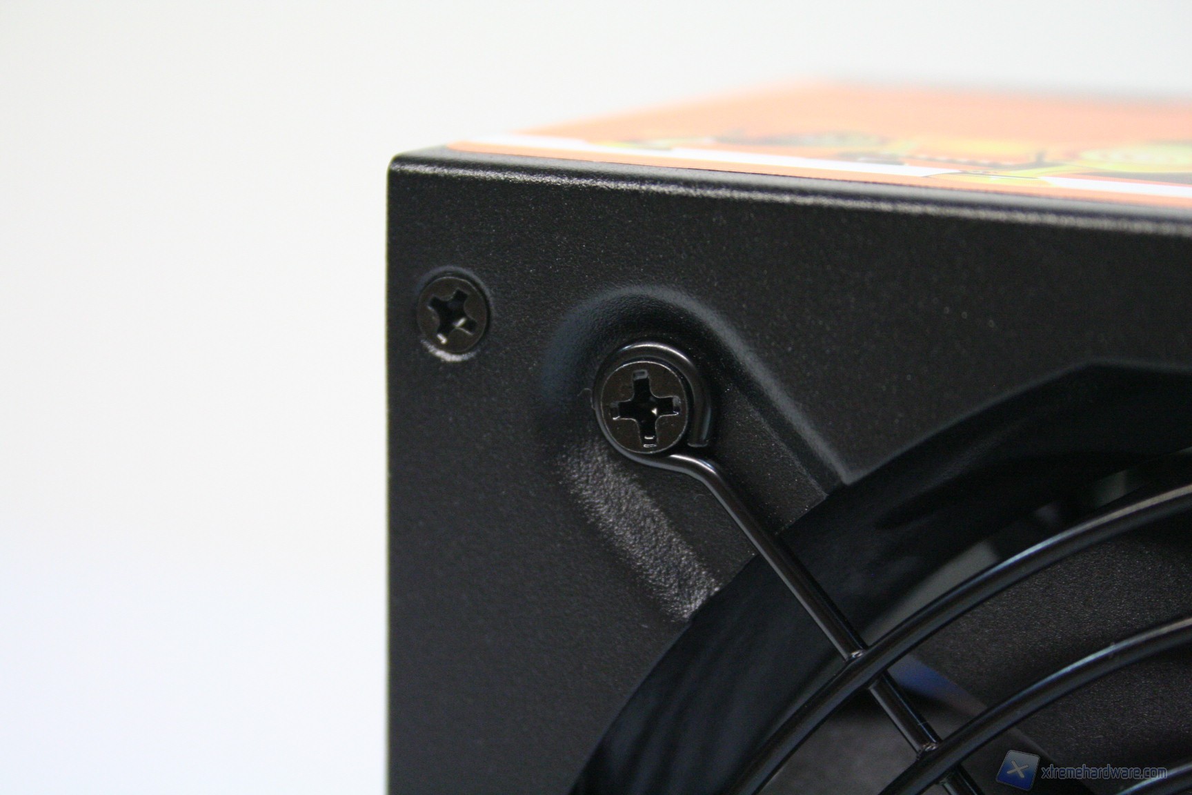 Il design esterno, sebbene presenti un layout standard, è abbastanza vivace, data la colorazione nera con sticker arancioni. La ventola, con una griglia superiore, ha un diametro di 135mm, mentre nella parte anteriore sono posizionati i connettori non modulari dell’unità. Non presenta particolarità degne di menzione in quanto posteriormente ci sono le classiche fessure a nido d’ape, un connettore di alimentazione identico allo standard ed un pulsante di accensione classico, non maggiorato. Gli sticker laterali sono molto carini e presentano un toro stilizzato, che rimanda al nome della serie, assieme alla certificazione Ecova. Avremmo apprezzato di più se lo sticker con le specifiche fosse stato messo sulla destra, in modo da permetterne la visualizzazione una volta montato nel cabinet. Ad ogni modo, una volta acquistato, si presume che si conoscano già le specifiche tecniche.. L’alimentatore inoltre è stato pretestato con il test di massa “HI POT” e “QC” ed il test in questo caso risale a maggio 2012. Nella parte superiore possiamo trovare il seriale, anteriormente però. La verniciatura è buona e non sono presenti sbavature od imperfezioni.