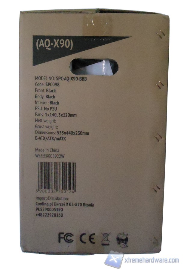 Nella parte laterale della confezione sono riportate le specifiche del case (in inglese), oltre a essere riportata la fabbricazione (Made in China) e i dati dell’importatore del prodotto (in questo caso il webshop cooling.pl)