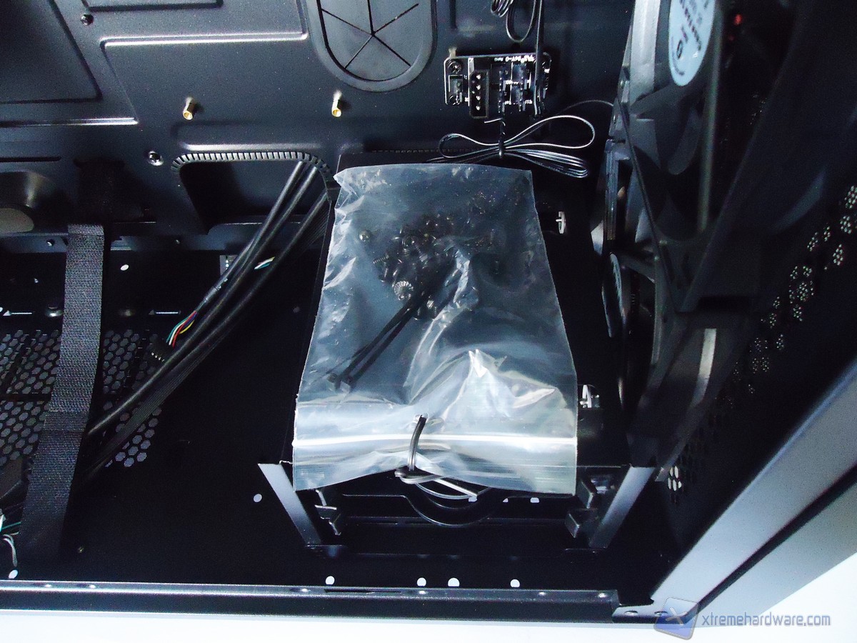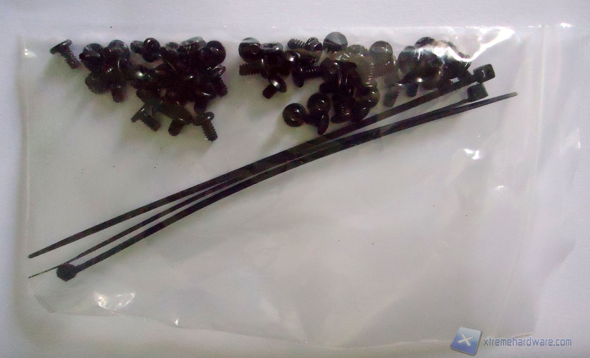 All’interno della confezione non troveremo alcun libretto di istruzioni, ma un semplice foglio che spiega come rimuovere i filtri per la polvere. Il bundle, comprendente 3 fascette in plastica nera e la viteria necessaria all’assemblaggio, è contenuto in una bustina che è adagiata sul cage degli hard disk.