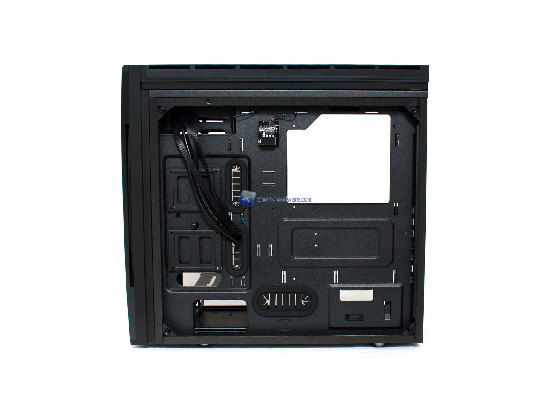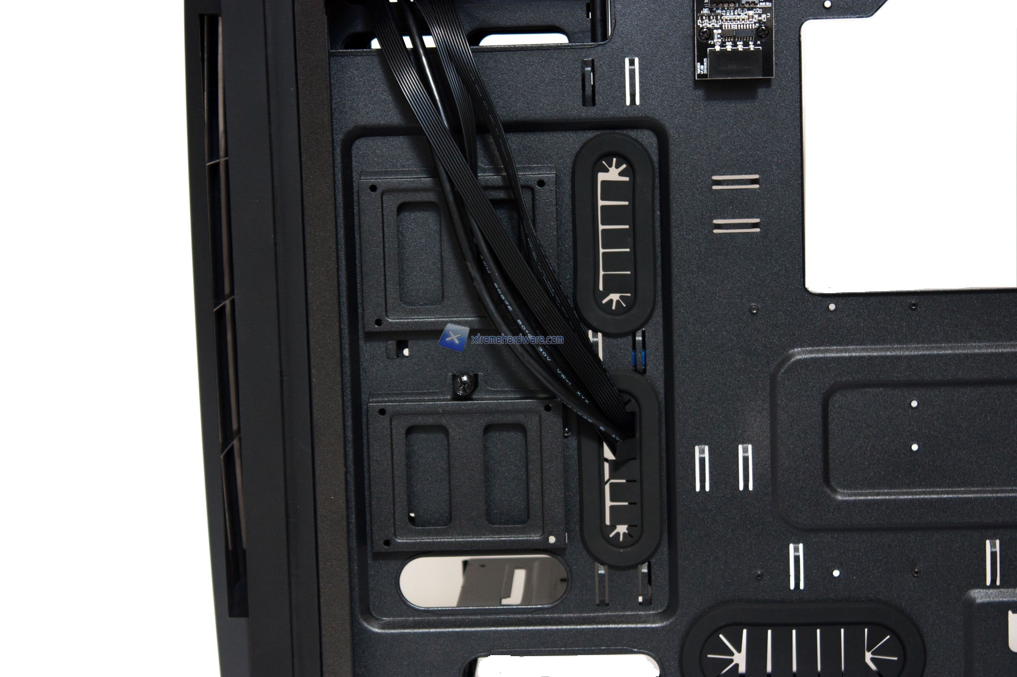 Partendo dalla zona centrale troviamo sempre il classico foro, di buone dimensioni, nel Tray della scheda madre che ci permetterà di installare i dissipatori a seguire. Esso è contornato da alcuni fori con relativi passacavi in gomma per il successivo cablaggio e organizzazione.