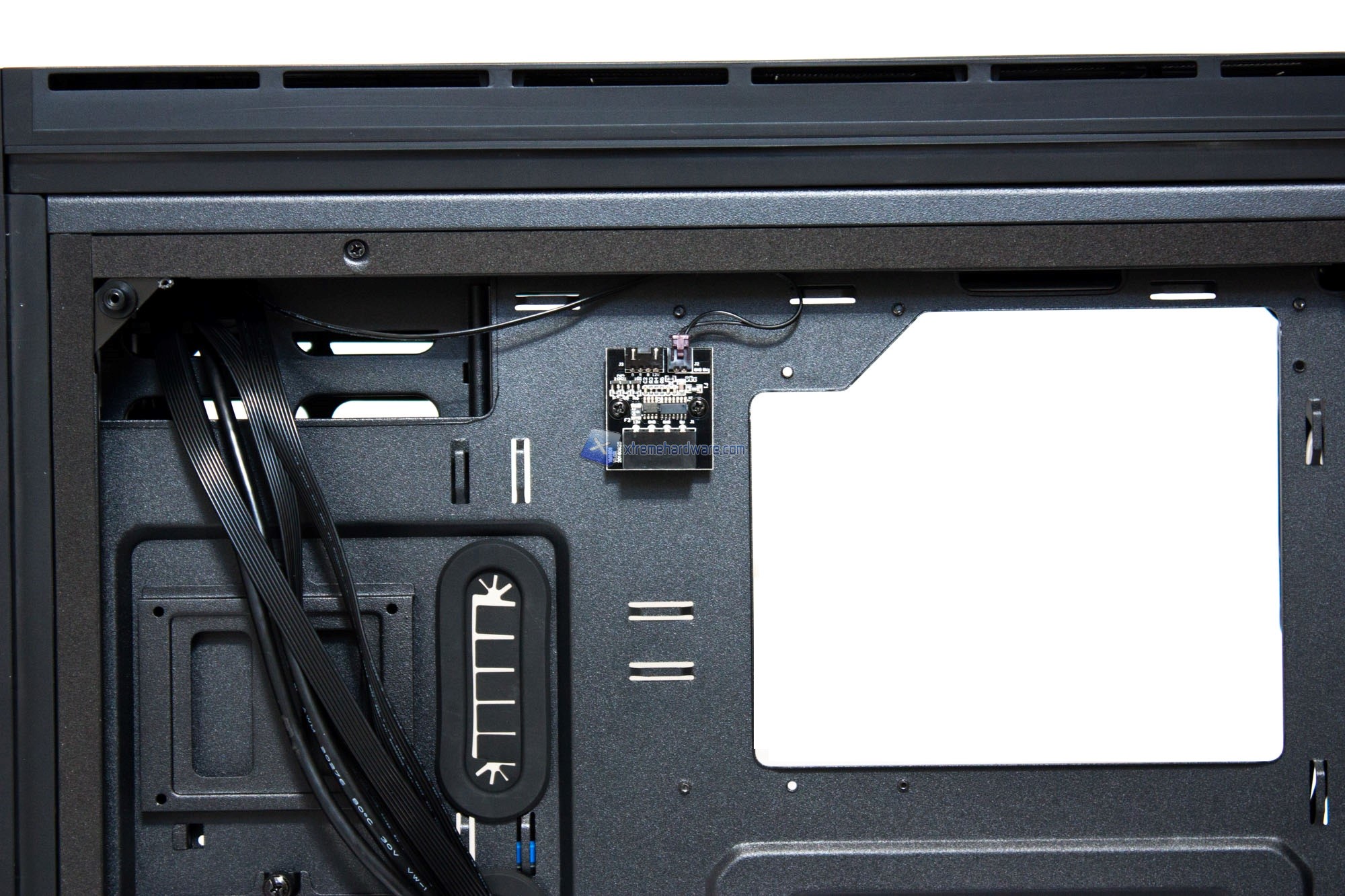 Ruotando ora il case e portandoci nel retro osserviamo subito il piccolo controller integrato nel caso tramite il quale potremo regolare il colore del bracket del sistema BitFenix SSD Chroma. Controller essenziale e caratterizzato da un connettore Molex e due Header di cui uno collegato al Tasto sul Top. Dovremo quindi solo collegare il cavo proveniente dal bracket per essere operativi e pronti a poter cambiare colore dei LED posti nel bracket di plastica.