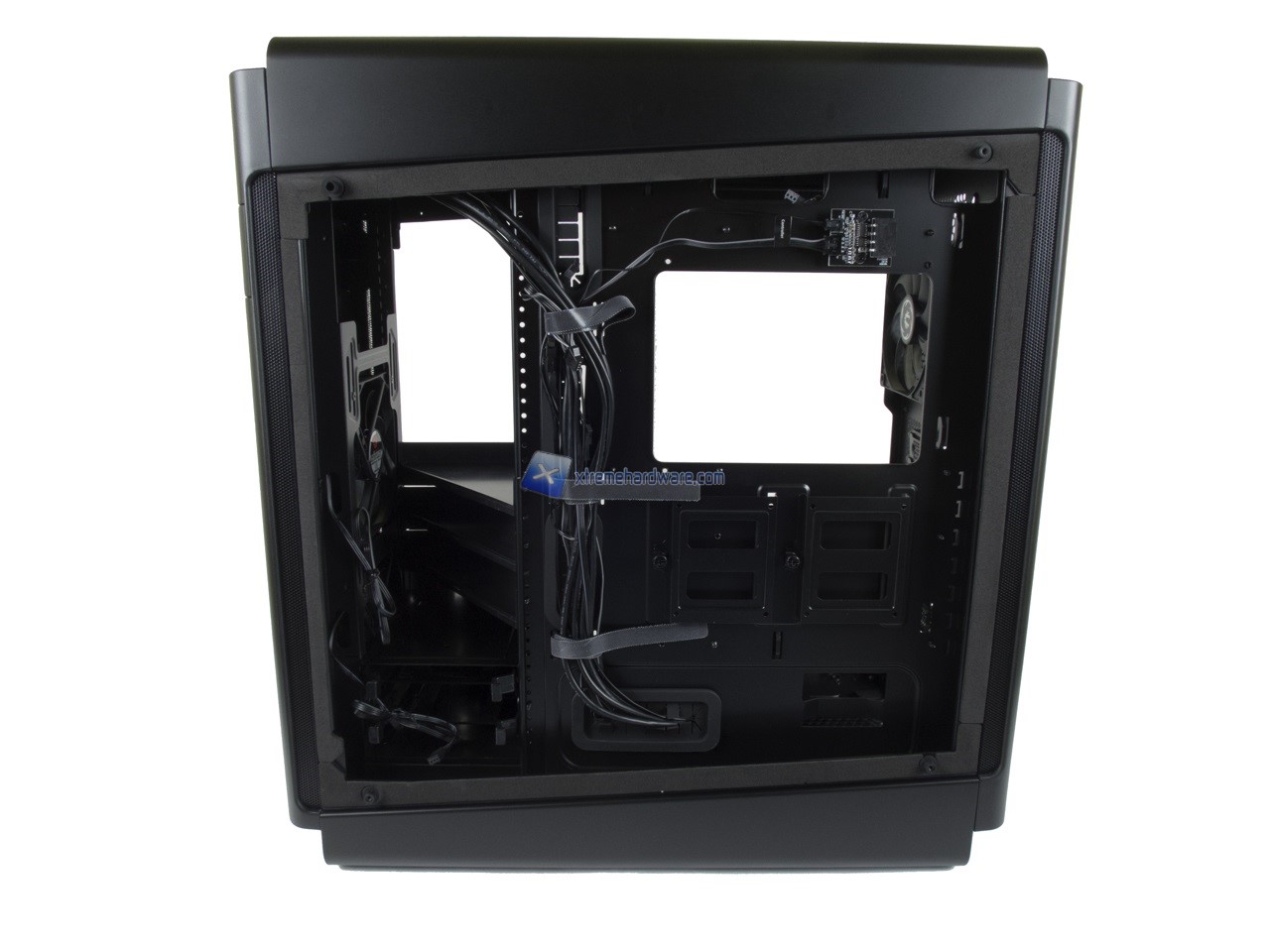 Rimosse le quattro viti per lato e rimossi con estrema attenzione i pannelli di Vetro possiamo dare uno sguardo allo spazio interno che il BitFenix Shogun ci mette a disposizione. Rimosso il pannello che da accesso al Tray della scheda madre possiamo notare subito la quantità di spazio che avremo a disposizione.