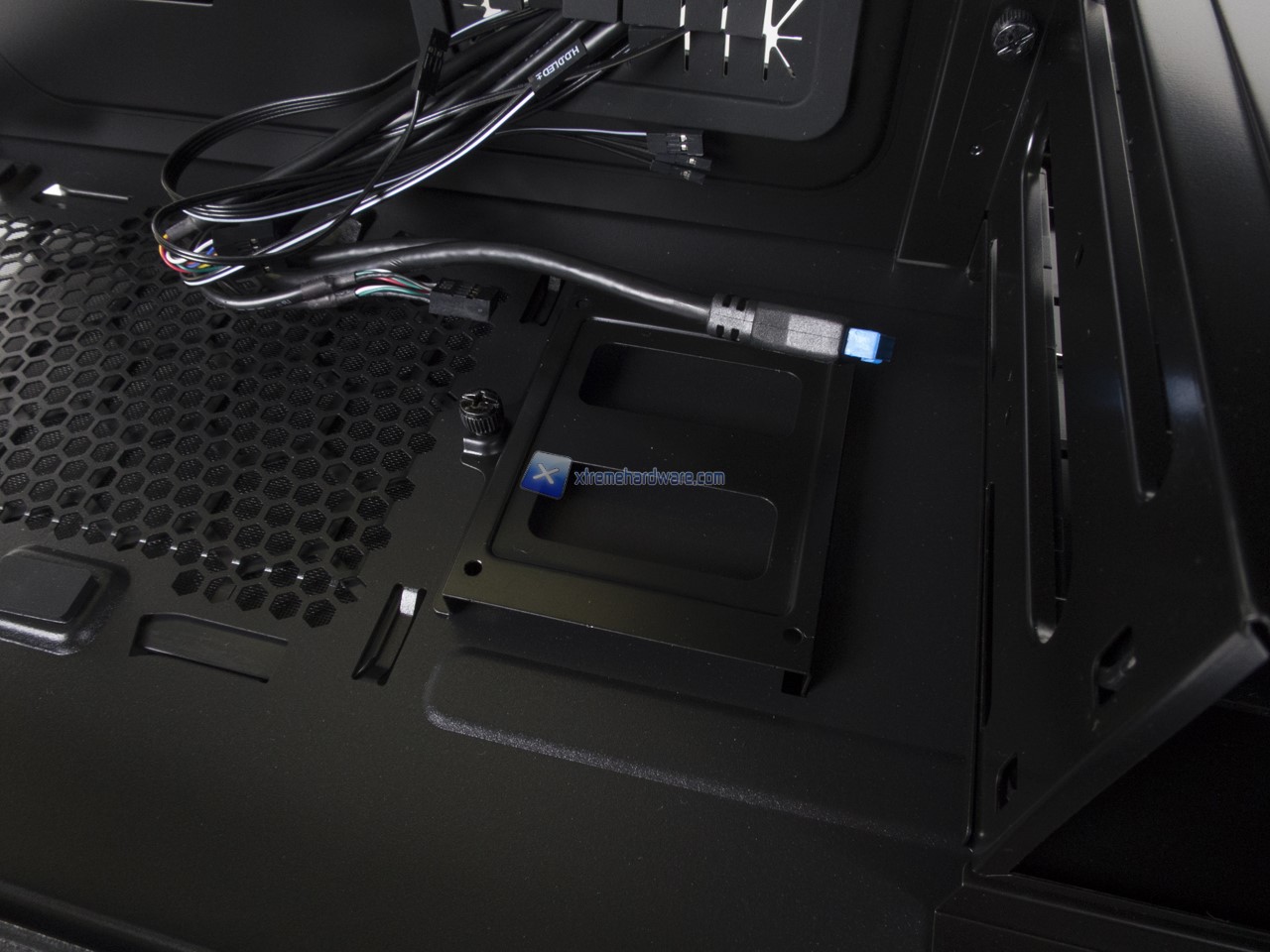Prima di passare al lato superiore interno vi mostriamo come rimuovendo momentaneamente il supporto SSD Chroma potremo accedere ad un ulteriore Cage per SSD e Hard Disk più un Tray per singolo SSD. Tray che potrà essere rimosso dall’attuale posizione e inserito sul Cage a lato previa rimozione di uno o due supporti GPU Safe. Giusto per dirvi che potrete sfruttare diverse combinazioni di modularità.