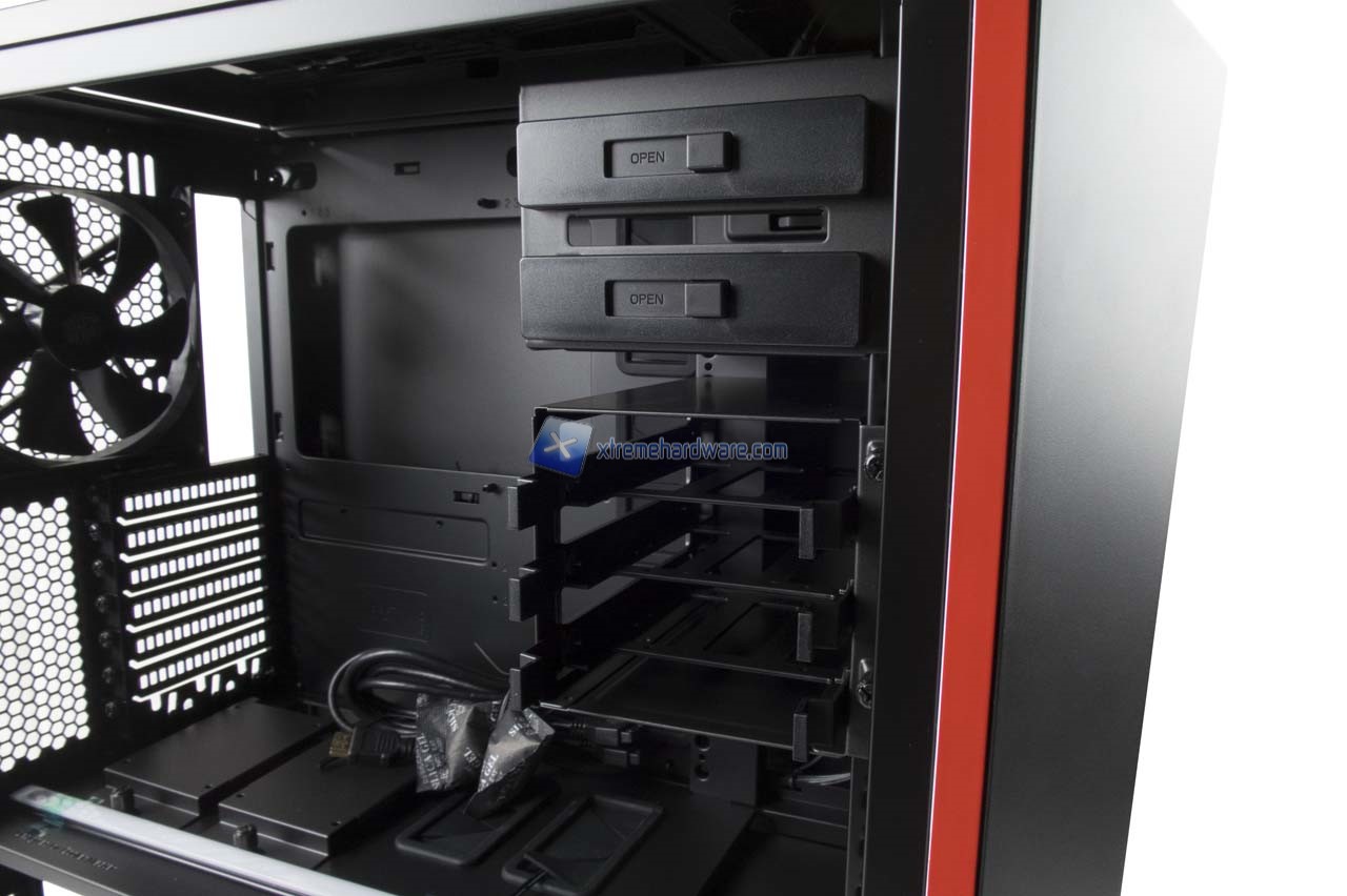 Tornando in alto ma stavolta nel lato destro troviamo i Cage per unità ottiche da 5,25’’ e per Hard Disk da 3,5’’ e SSD. Come da precedente esperienza potremo variare la posizione di questi cage su tutto l’asse verticale grazie ai fori di fissaggio su entrambi i lati o passare alla rimozione completa.