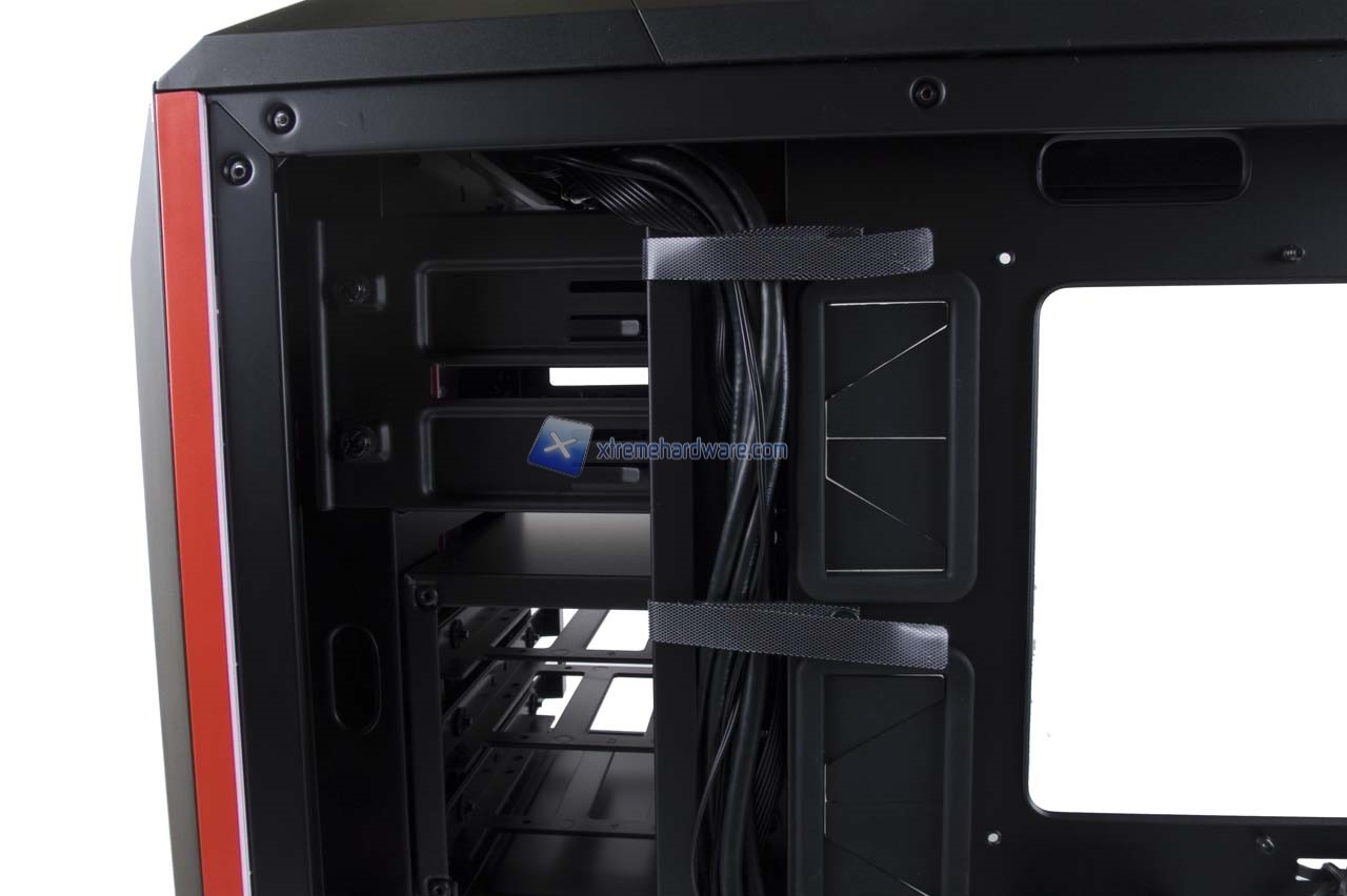 Rimossi dunque i pannelli laterali possiamo procedere a dare il consueto sguardo anche all’interno del case. Il Cooler Master MasterCase Maker 5 MSI Dragon Edition come gli altri modelli dell’omonima serie seppur un Mid-Tower offre adeguato spazio per ogni tipologia di configurazione. In aggiunta il già citato sistema FreeForm Modular ci permetterà di aggiungere o rimuovere Cage e altri componenti alla struttura interna per massimizzare l’installazione e eventualmente anche il cablaggio. E’ comunque facilmente visibile lo spazio a nostra disposizione.