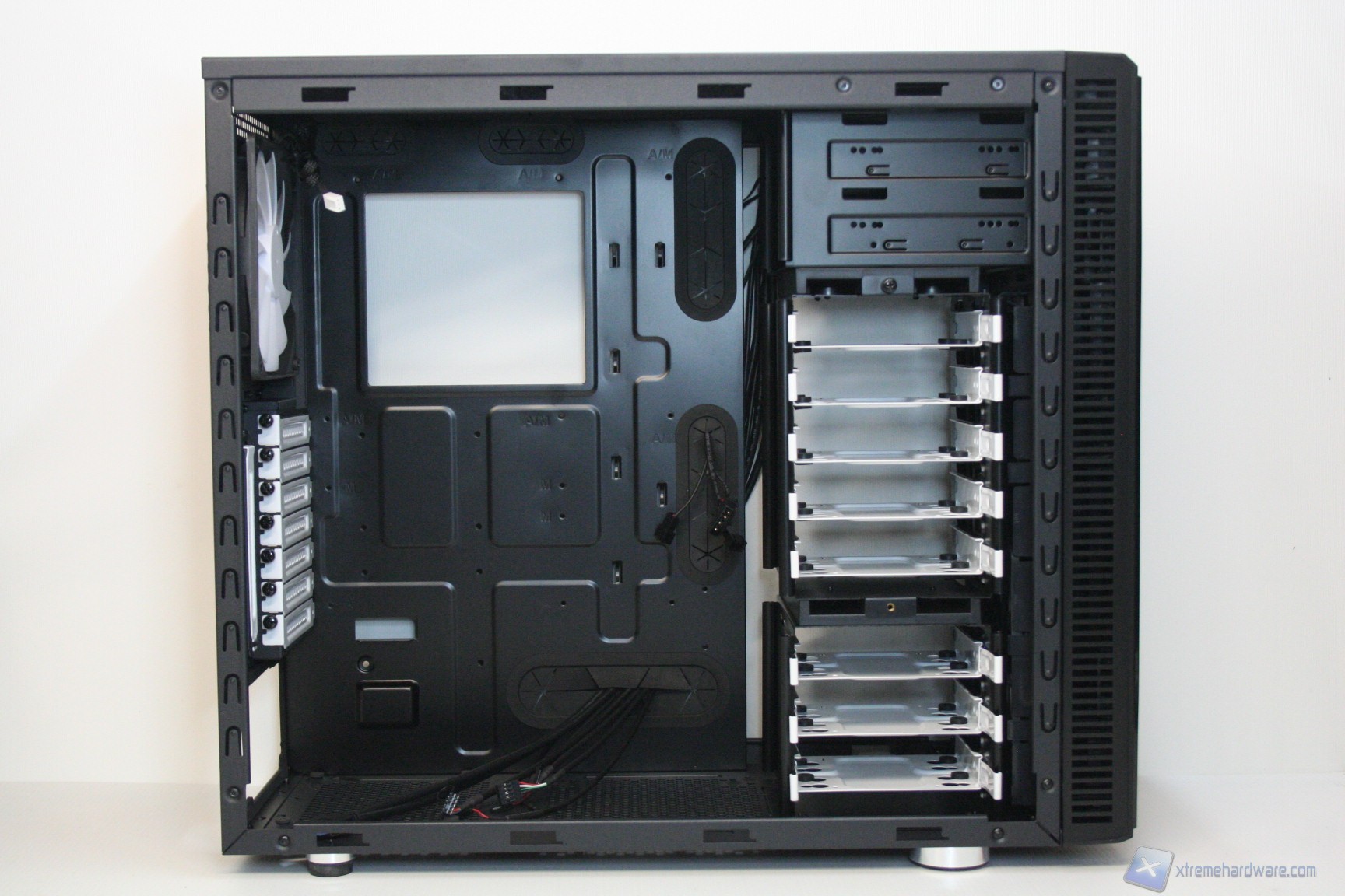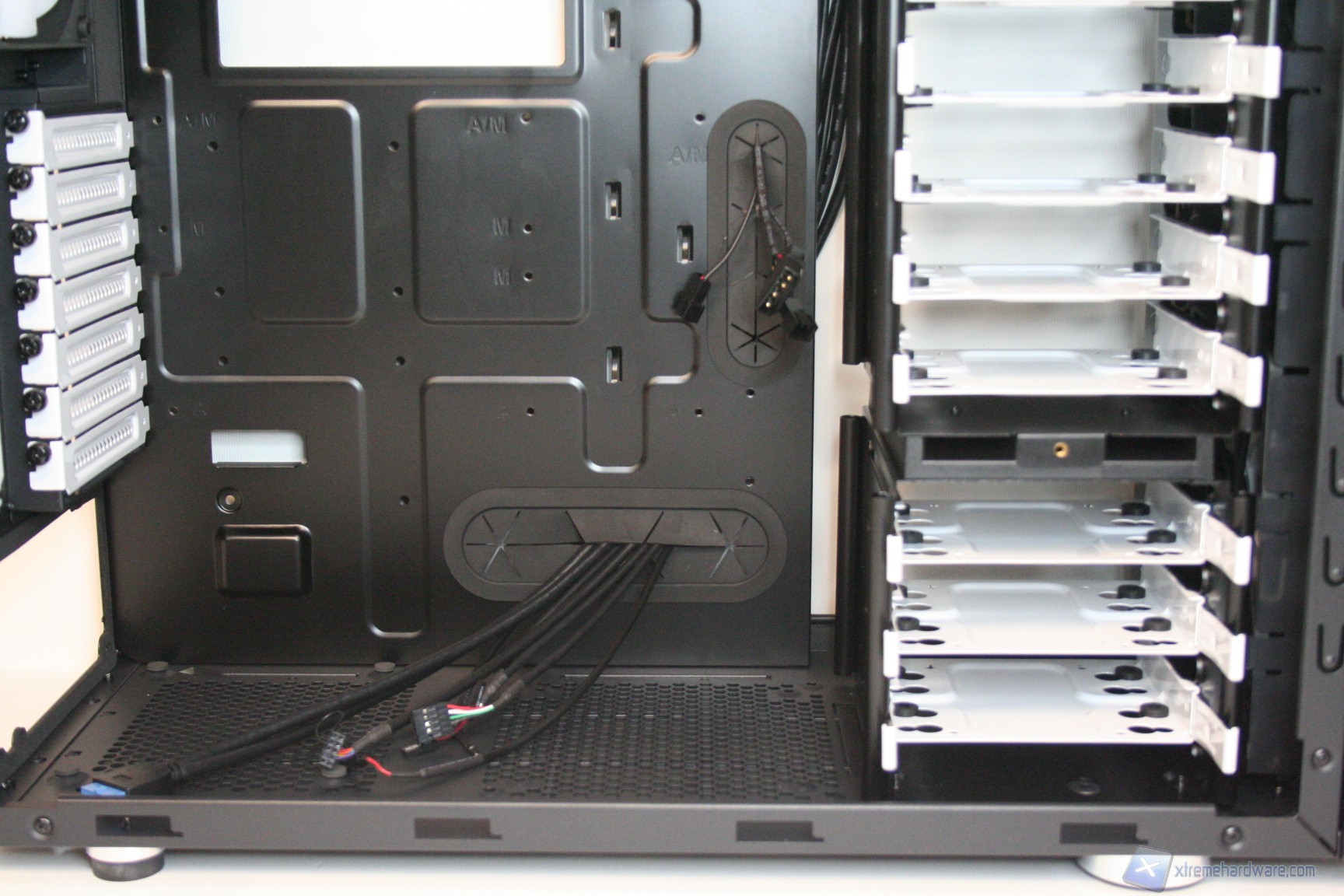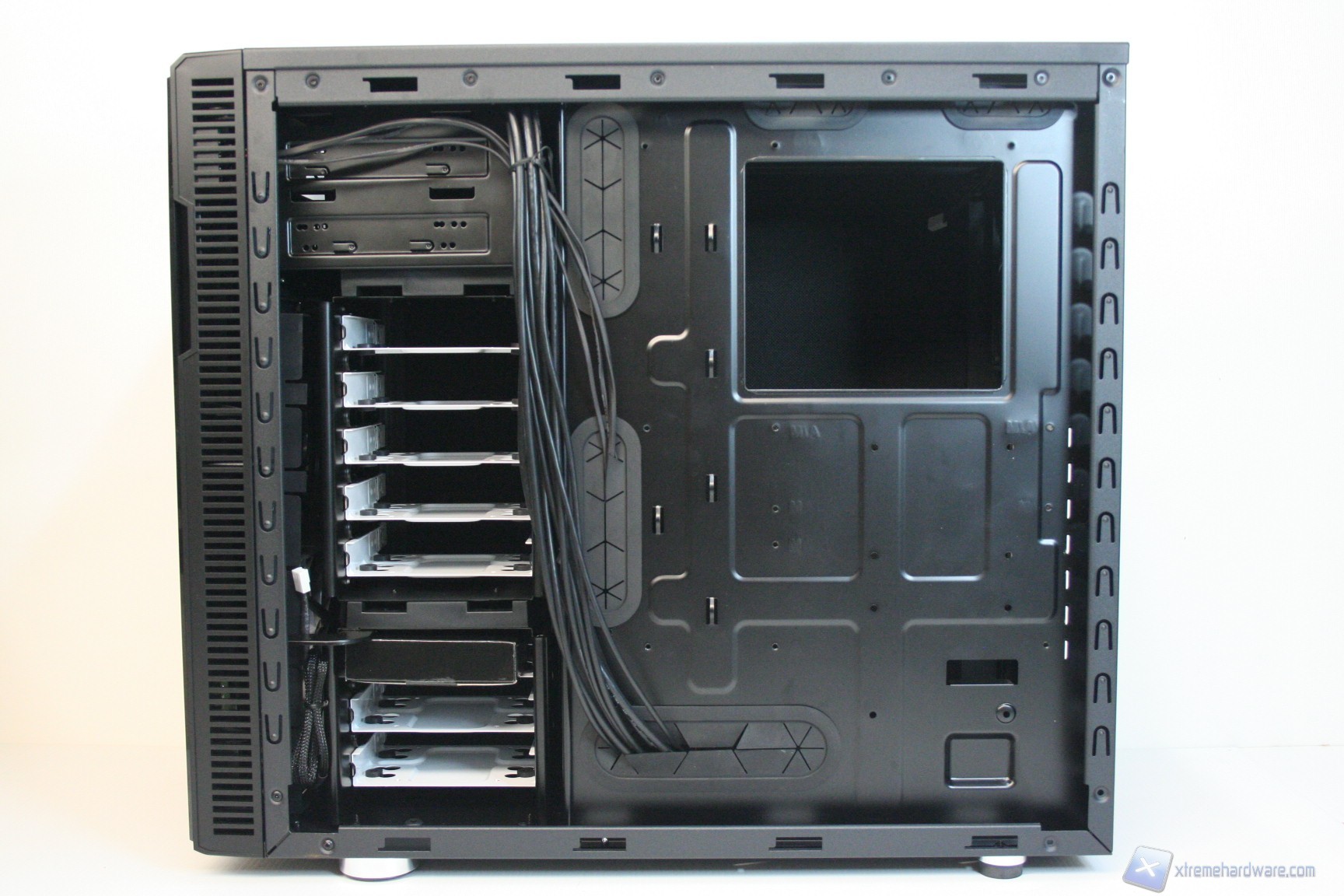 Una volta aperta la parte laterale destra, possiamo osservare la grande apertura per l’installazione di sistemi di ritenzione avanzati, per dissipatori aftermarket. E’ elevatissimo lo spessore di questa ziona, il che significa che sarà possibile mettere in atto un cablaggio eccellente. Sono presenti molti rilievi e profili per il passaggio dei cavi, oltre a ben cinque grandi guaine gommate, molto spesse e resistenti alle sollecitazioni (inferiori, centrali e superiori) per il passaggio dei cavi. E’ eccellente lo spazio dietro agli hard disk, meglio di così non si poteva fare. Non sono presenti ventole posteriori, ma tale aspetto è semplicemente intenzionale, perché i dischi rigidi sono già dissipati frontalmente. La solidità strutturale risulta molto elevata.
