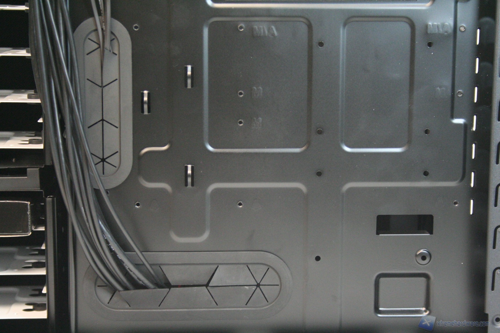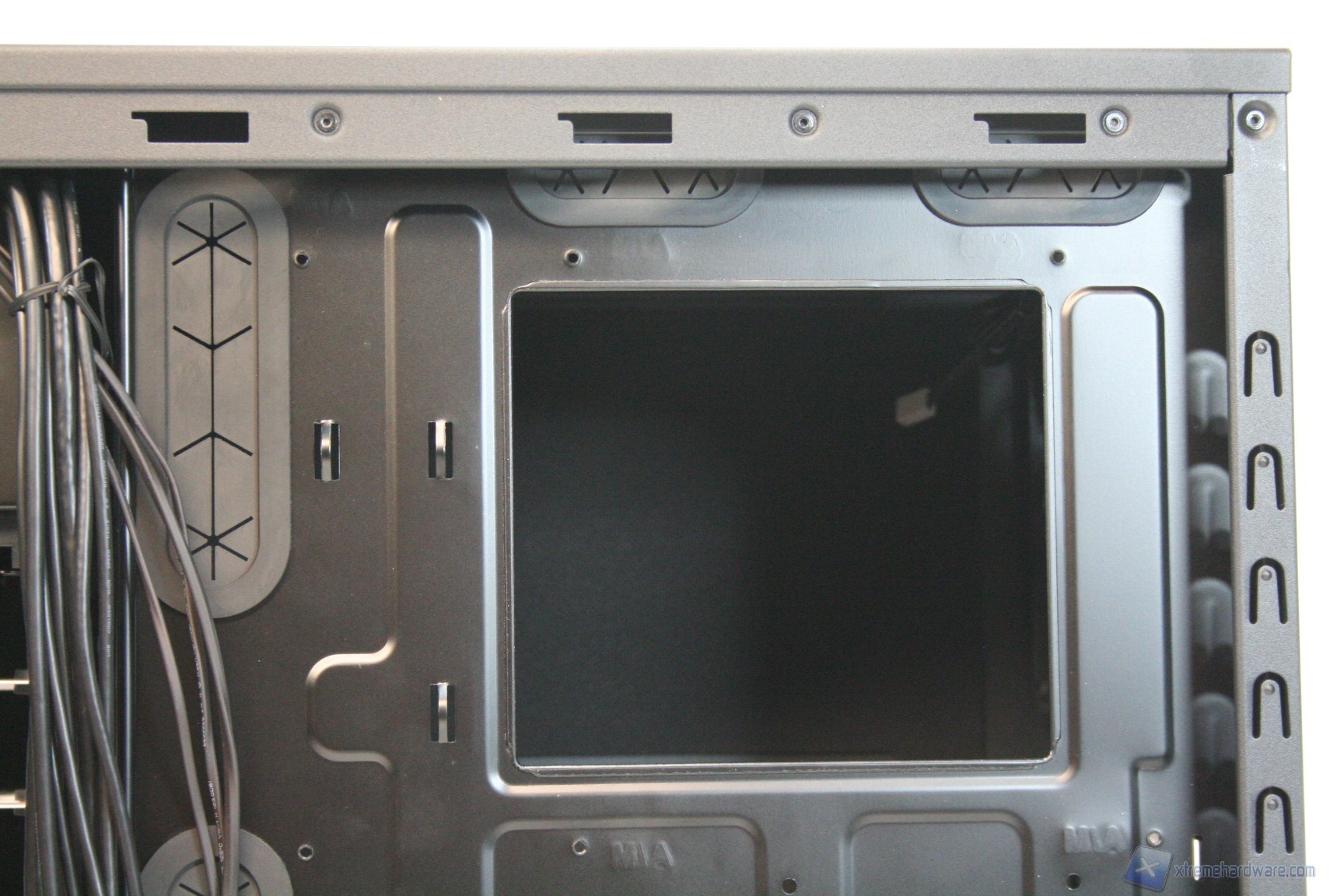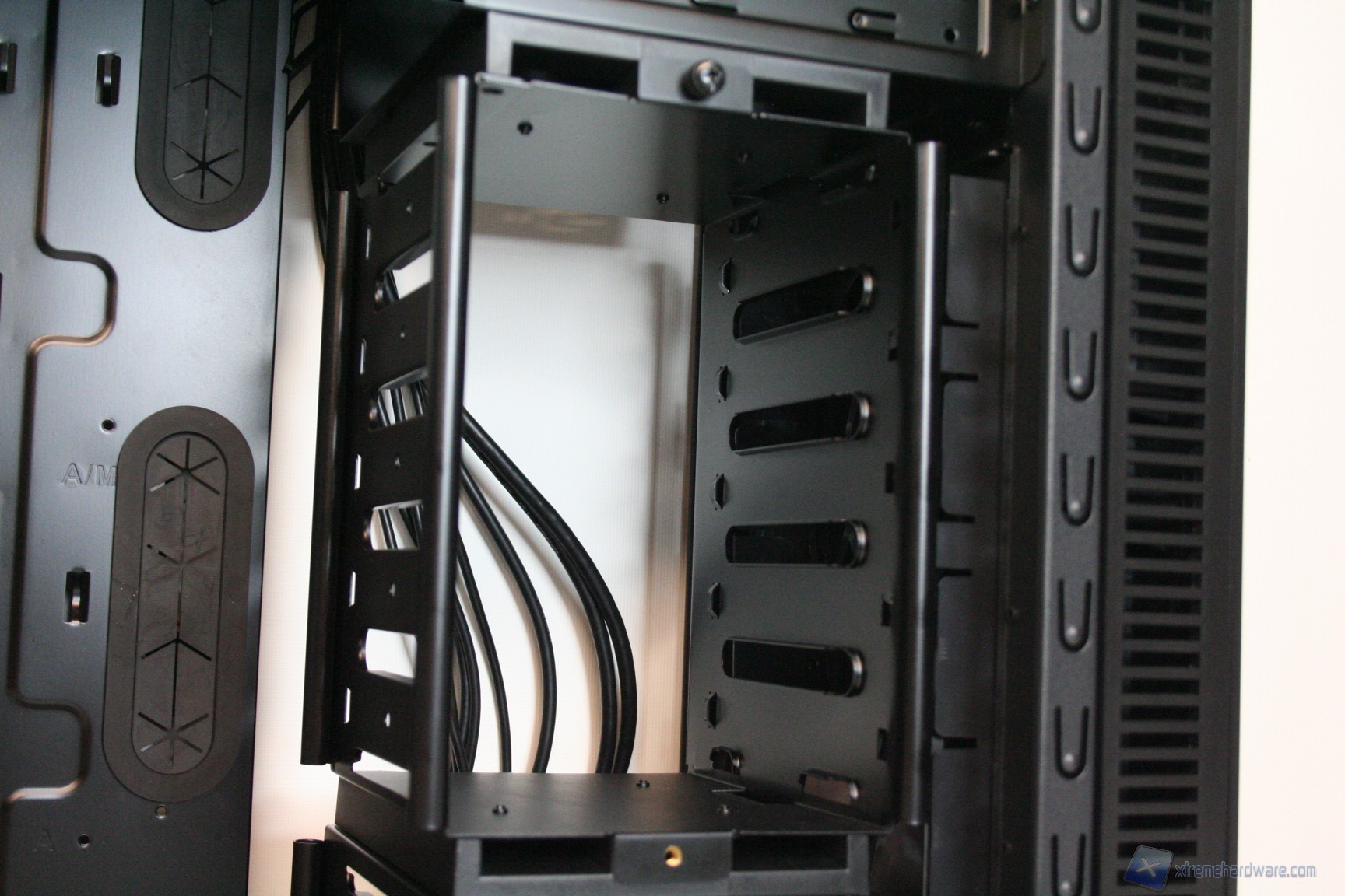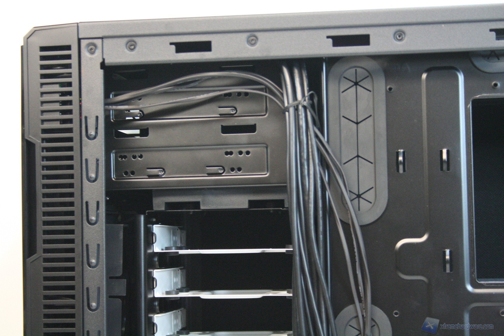 Una volta aperta la parte laterale destra, possiamo osservare la grande apertura per l’installazione di sistemi di ritenzione avanzati, per dissipatori aftermarket. E’ elevatissimo lo spessore di questa ziona, il che significa che sarà possibile mettere in atto un cablaggio eccellente. Sono presenti molti rilievi e profili per il passaggio dei cavi, oltre a ben cinque grandi guaine gommate, molto spesse e resistenti alle sollecitazioni (inferiori, centrali e superiori) per il passaggio dei cavi. E’ eccellente lo spazio dietro agli hard disk, meglio di così non si poteva fare. Non sono presenti ventole posteriori, ma tale aspetto è semplicemente intenzionale, perché i dischi rigidi sono già dissipati frontalmente. La solidità strutturale risulta molto elevata.