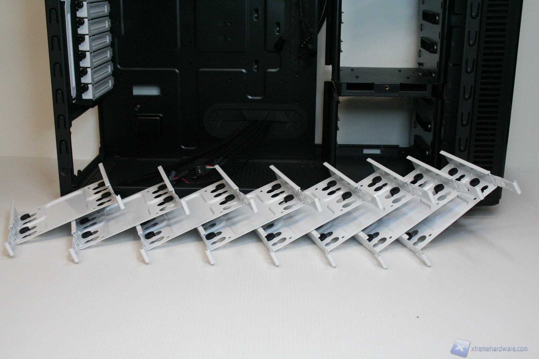 Una volta rimossa la rigidissima paratia laterale, possiamo subito accorgerci dell’ottima qualità costruttiva interna. Spicca immediatamente la colorazione bianca degli slot per l’installazione degli hard disk. E’ spazioso quanto basta per un potente sistema e permetterà persino l’integrazione di sistemi a liquido dalla media potenza.