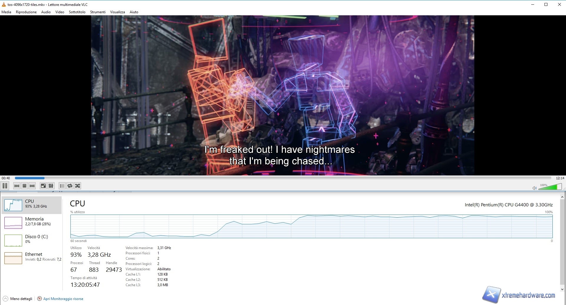 Notiamo come la riproduzione è stata eseguita con una percentuale di carico per la CPU di 10% e frequenza di 1,9GHz durante la riproduzione del filmato in FHD con codec H.264 mentre siamo passati alla totale saturazione durante la riproduzione del video in 4K con codec H.265 avvertendo anche notevoli scatti. Ovviamente e come vediamo in questo caso abbiamo avuto un utilizzo del 99% alla frequenza massima di 3,28GHz. Notiamo altresì che per una riproduzione in altà qualità e alta risoluzione, come può essere un video o film in 4K con codec H.265, il Pentium G4400 non garantisca alcun valido risultato almeno con il software VLC. Infatti per controprova abbiamo utilizzato il software Media Player Classic chiamato anche MPC-HC e possiamo vedere come tutto sia cambiato. La riproduzione del file con codec H.264 ha restituito una percetuale di utilizzo del 5% con una frequenza di 0,89GHz mentre passando al file, con cui abbiamo avuto grossi problemi con VLC, abbiamo avuto valori di utilizzo del 45% con una frequenza di 3,25GHz. Comprendiamo dunque come in questo caso il Pentium G4400 offra valide prestazioni e i problemi sono stati causati da un problema software e non hardware. Consigliamo dunque agli utenti di utilizzare il software MPC-HC al posto di VLC, almeno per il momento.
