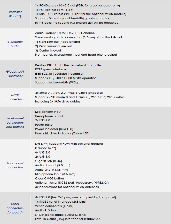 L'audio è di tipo 5.1 , con il codec hardware Audio Codec: IDT 92HD89C, dotato di 3 uscite analogiche da 3,5 mm al pannello posteriore. È presente il Gigabit-LAN Controller Realtek RTL 8111E Ethernet network dotato di velocità pari a 10 / 100 / 1.000 Mbit/s. Per quanto riguarda le connessioni interne abbiamo 4x Serial ATA rev2.0 3Gb/s, per le quali due cavi SATA sono in dotazione. Abbiamo inoltre il supporto per le modalità Raid 0 ed 1 sui sistemi operativi Windows xp e Windows 7.