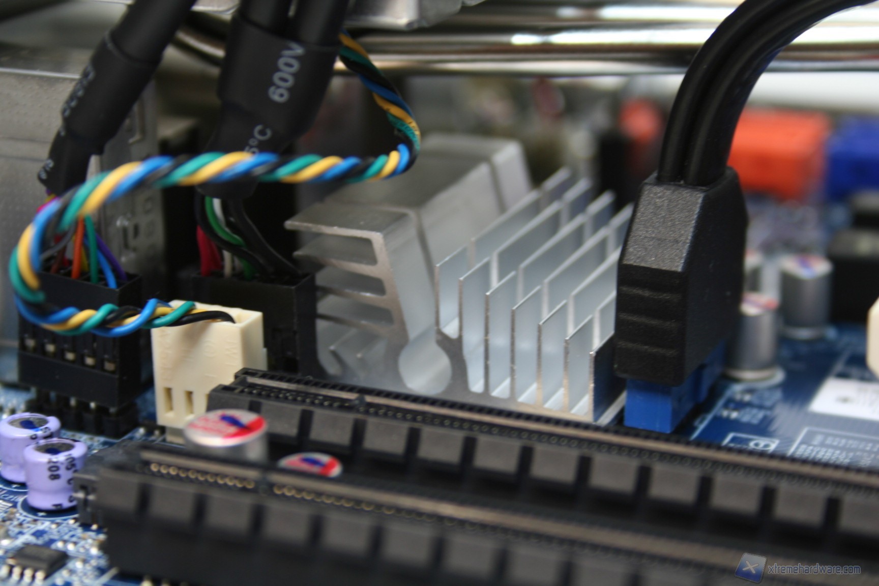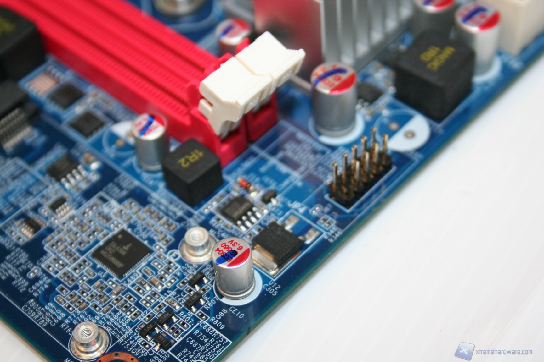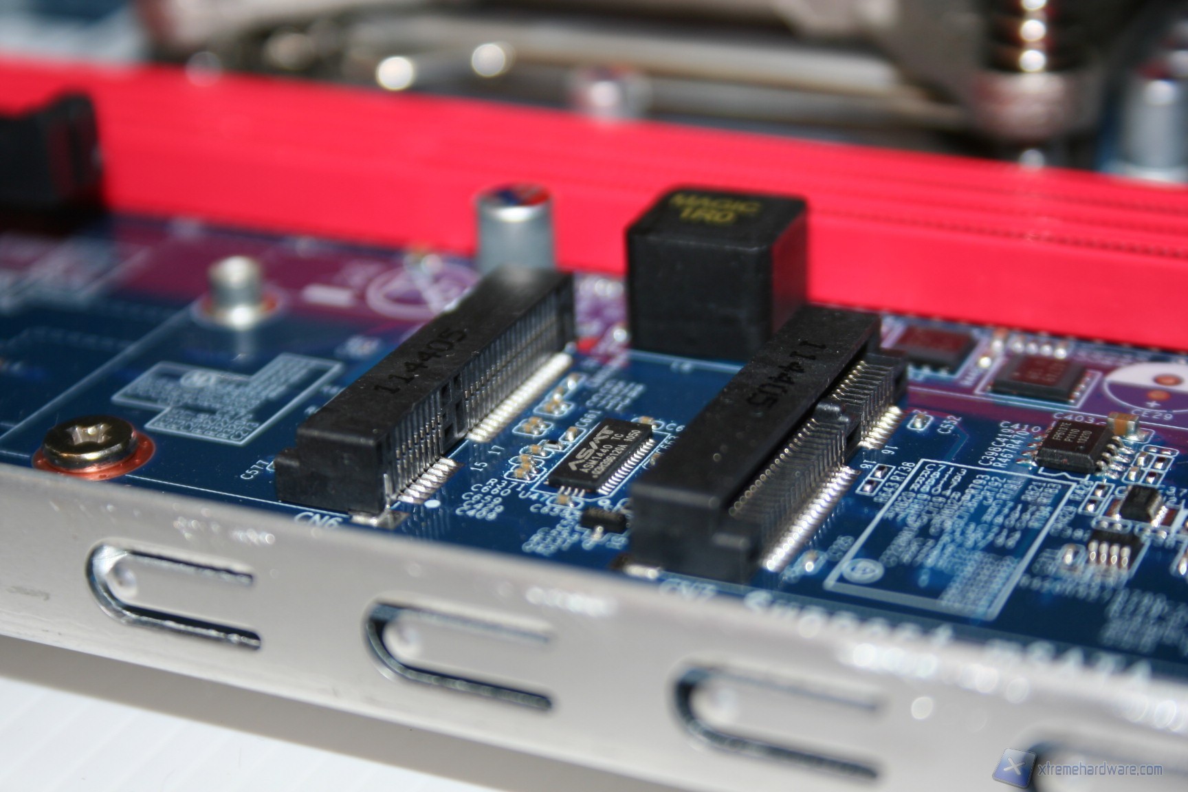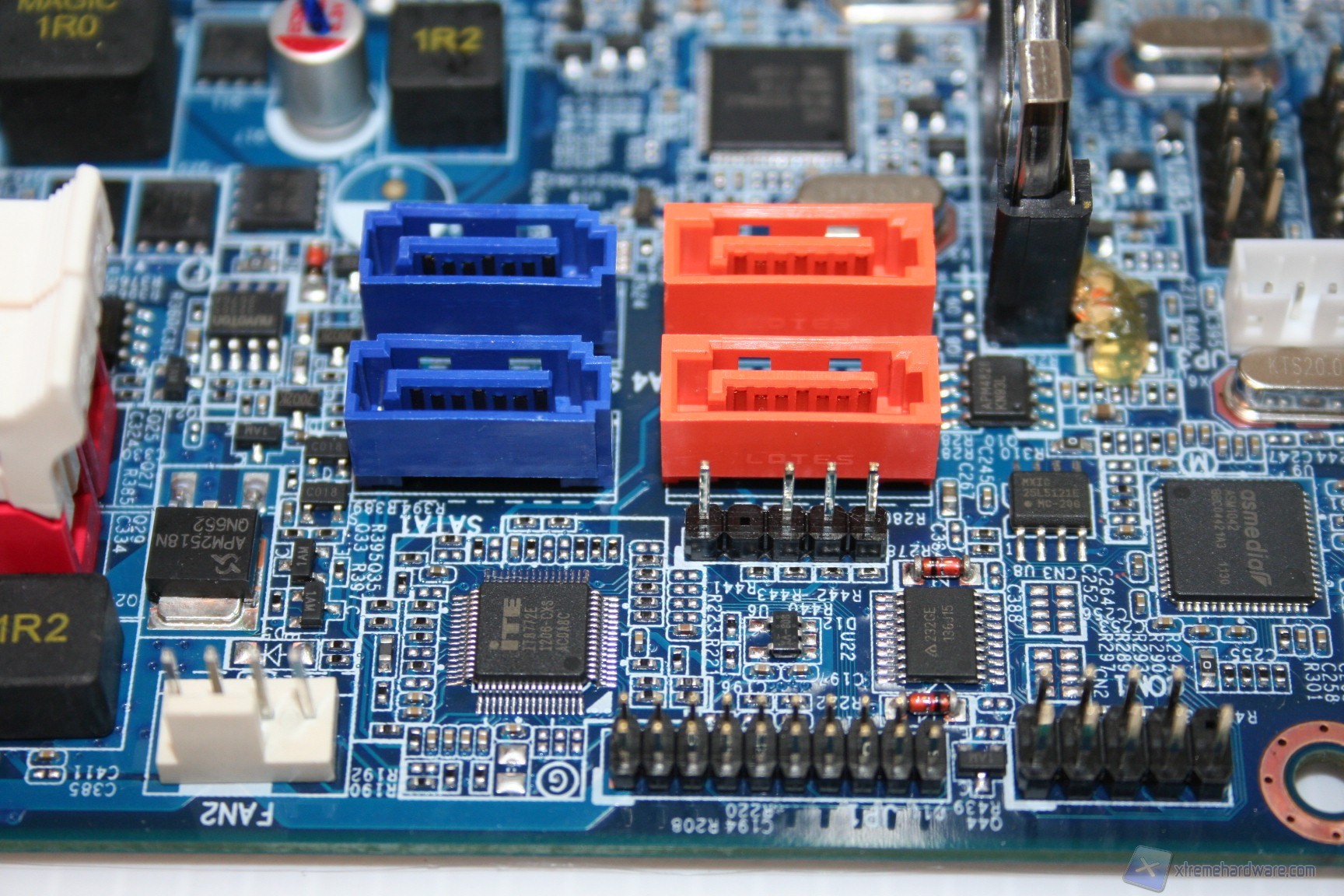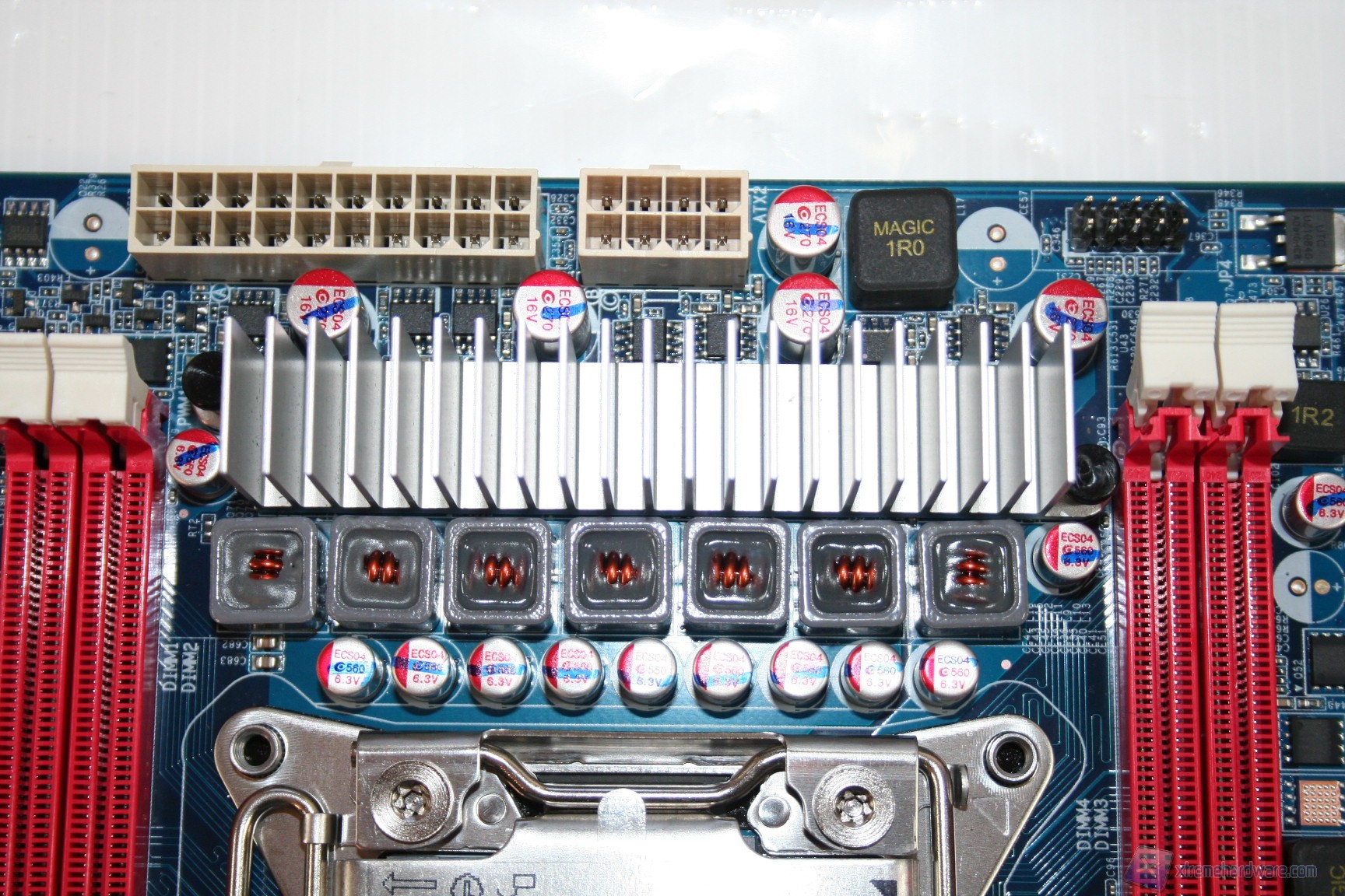Le fasi di alimentazione, data la tipologia dei processori potenziali, sarebbero dovute essere molte, ed infatti ne troviamo ben sette, più una per ogni coppia di memorie RAM. L’organizzazione delle componenti è davvero ottima, come è notevole il grado di pulizia e lavorazione. I banchi di RAM presentano il vecchio ed ottimo sistema di bloccaggio binato, a differenza di quello singolo che si sta cominciando ad utilizzare, e che risulta problematico in determinati casi. Al contrario, per ragioni di spazio e praticità, gli ingressi PCI-E non presentano nessun sistema di bloccaggio, bensì semplicemente uno ad incastro orizzontale. Questo sistema è davvero molto pratico e quindi adatto alla tipologia di cabinet. I dissipatori utilizzati sono semplici ma efficaci, sebbene però siano in alluminio e non in rame. Dato il costo e data la necessità di dissipare calore grazie alle CPU impegnative, sarebbe stato carino inserirli. Altra nota da migliorare è l’inclusione di bobine di arresto non scudate, che di solito su componenti del genere vengono adoperate di migliore qualità. Comunque sia ciò non rappresenta un problema rilevante, e non sono presenti rumori derivanti da picchi di frequenza sotto carico. Nel PCB troviamo due connettori SATA 2.0 e due SATA 3.0, in blu. La compatibilità con le configurazioni RAID è elevata in quanto essendo gestita direttamente dall’ Intel® X79 Express Chipset (codename: " Patsburg") - chiamato anche PCH (Platform Controller Hub) or South bridge - è permesso il RAID0,1,5 e 10.