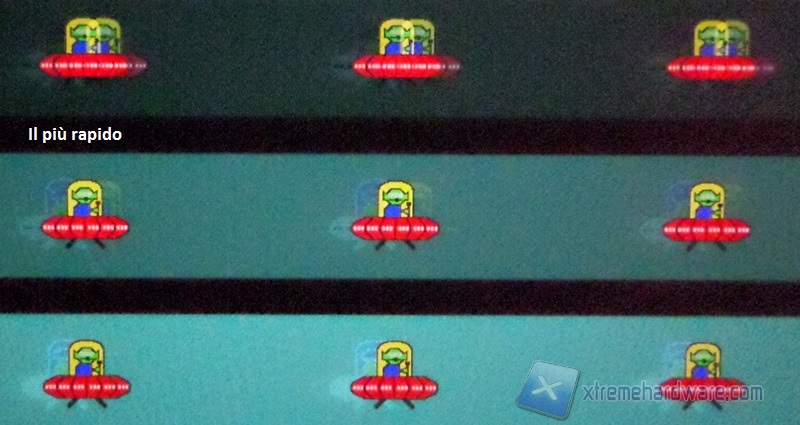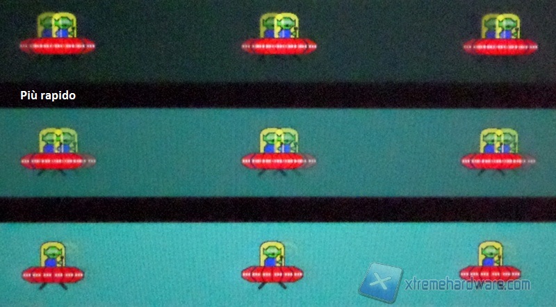 Di default è selezionato il valore intermedio ed è anche quello che offre il comportamento migliore. Il valore meno reattivo crea un effetto ghosting un poco maggiore (e sempre riscontrabile in questo particolare test), mentre il setting opposto genera artefatti dati da un reverse ghost abbastanza visibile, indice di un overshoot di segnale.