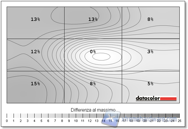 Suddividendo lo schermo in nove rettangoli, abbiamo misurato con il colorimetro l’uniformità della luminosità e dei colori. La differenza massima registrata è risultata pari al 15%, con una media dell’8,6%, per quanto riguarda la luminosità, mentre per il colore, il Delta-E maggiore è stato di 5,4, con una media del 2,6. Il risultato è un po’ sottotono, soprattutto per la zona sinistra.