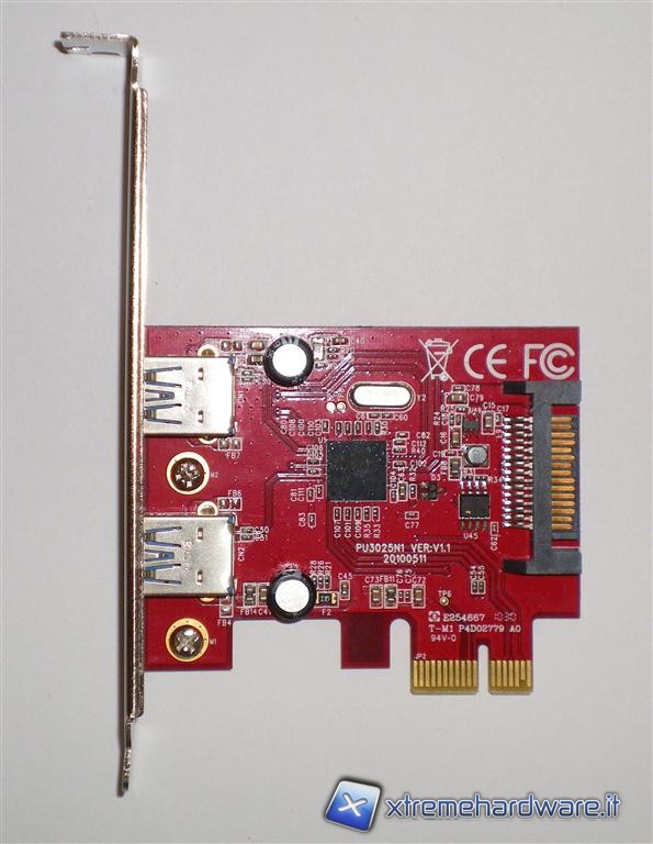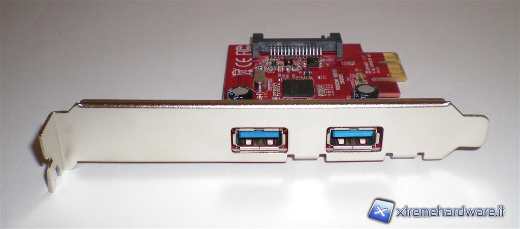 Il pcb è collegato ad una staffa tramite apposite viti. Nella parte posteriore possiamo osservare le due porte USB 3.0 di colore blu, notiamo invece all'interno del pcb una porta SATA che sfrutta la connessione PCI-Express e il controller NEC messo a disposizione. L'interfaccia PCi-Express è di tipo 1x.