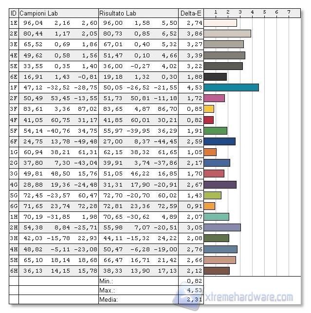 Più che positivo il risultato dell’analisi della fedeltà cromatica, con un Delta-E medio di 2,31. Dell fornisce il monitor già pre-calibrato con un Delta-E medio inferiore a 5 e come è possibile vedere dal grafico sottostante, nessuna tonalità supera tale soglia.