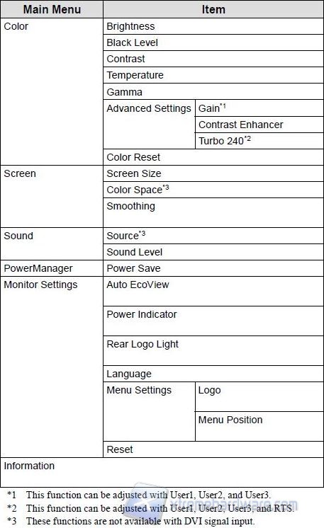 Nel manuale è presente l’esploso delle funzioni integrate nel menù OSD, dove alcuni parametri sono bloccati a seconda della modalità scelta. Ad esempio non è possibile disabilitare la funzione Turbo 240 su FPS1 e FPS, ed è impossibile abilitarla con quella Web.