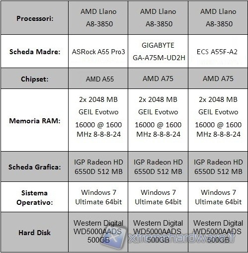 Abbiamo affiancato alla ECS A55F-A2 una ASRock A55 Pro3, anch’essa dotata di chipset A55 ed una Gigabyte GA-A75M-UD2H dotata, invece,  di chipset A75.