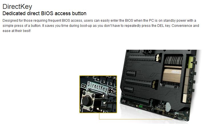 L’utilissimo tasto DirectKey consente l’accesso immediato al BIOS dallo stato di standby senza dover ricorrere all’attesa del boot ed alla pressione ripetuta del tasto CANC.