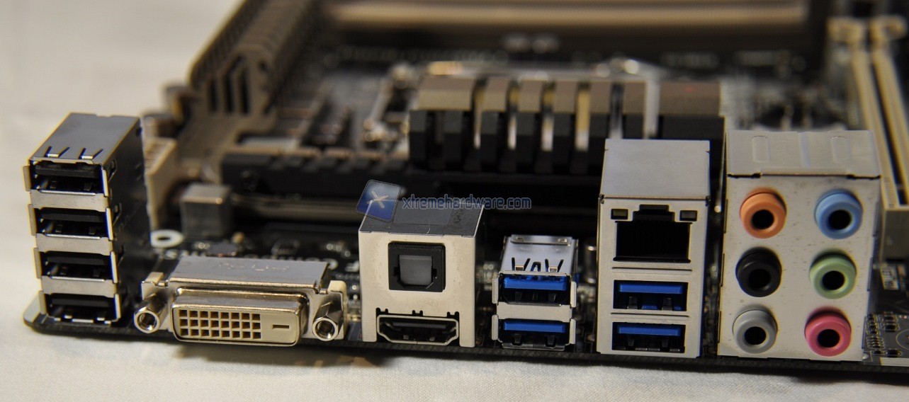 Il numero di porte USB è abbondante, distinguiamo per colore (blu) le 4 di tipo USB 3.0 a differenza delle altre (nere) più lente USB 2.0. Sono presenti 2 attacchi per l’uscita del video digitale HDMI e DisplayPort. L’attacco ethernet RJ45 è in standard Gigabit Intel. Oltre la porta ottica S/PDIF-OUT distinguiamo i 6 attacchi mini-Jack per il flusso Audio In / Out.