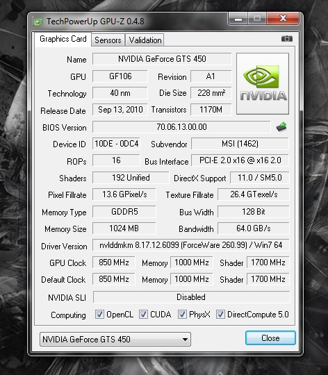 Il software GPU-Z 0.4.8 rileva correttamente tutte queste specifiche: