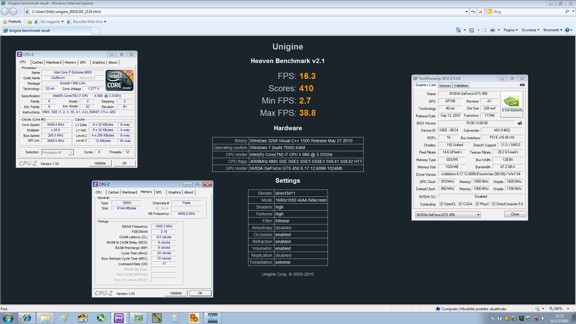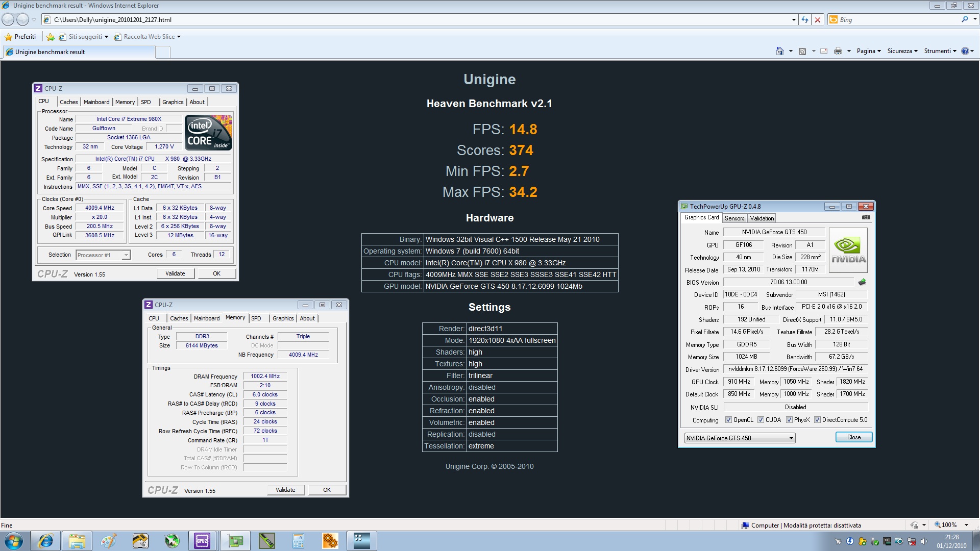 Di seguito vi mostriamo gli screen dell’Unigine Heaven 2.1 e del 3DMark Vantage, eseguiti con le suddette frequenze, su piattaforma Intel.