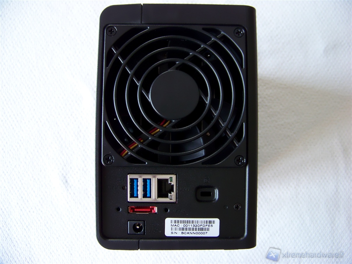 Sul retro possiamo trovare la ventola da 92mm atta all’espulsione di aria calda proveniente dall’interno del case e generata dal calore emesso dagli hard disk posizionati al suo interno, sotto di essa, inoltre, troviamo le due porte USB 3.0, la porta LAN RJ-45, una porta eSATA e, sotto di essa, il connettore per l’alimentazione.