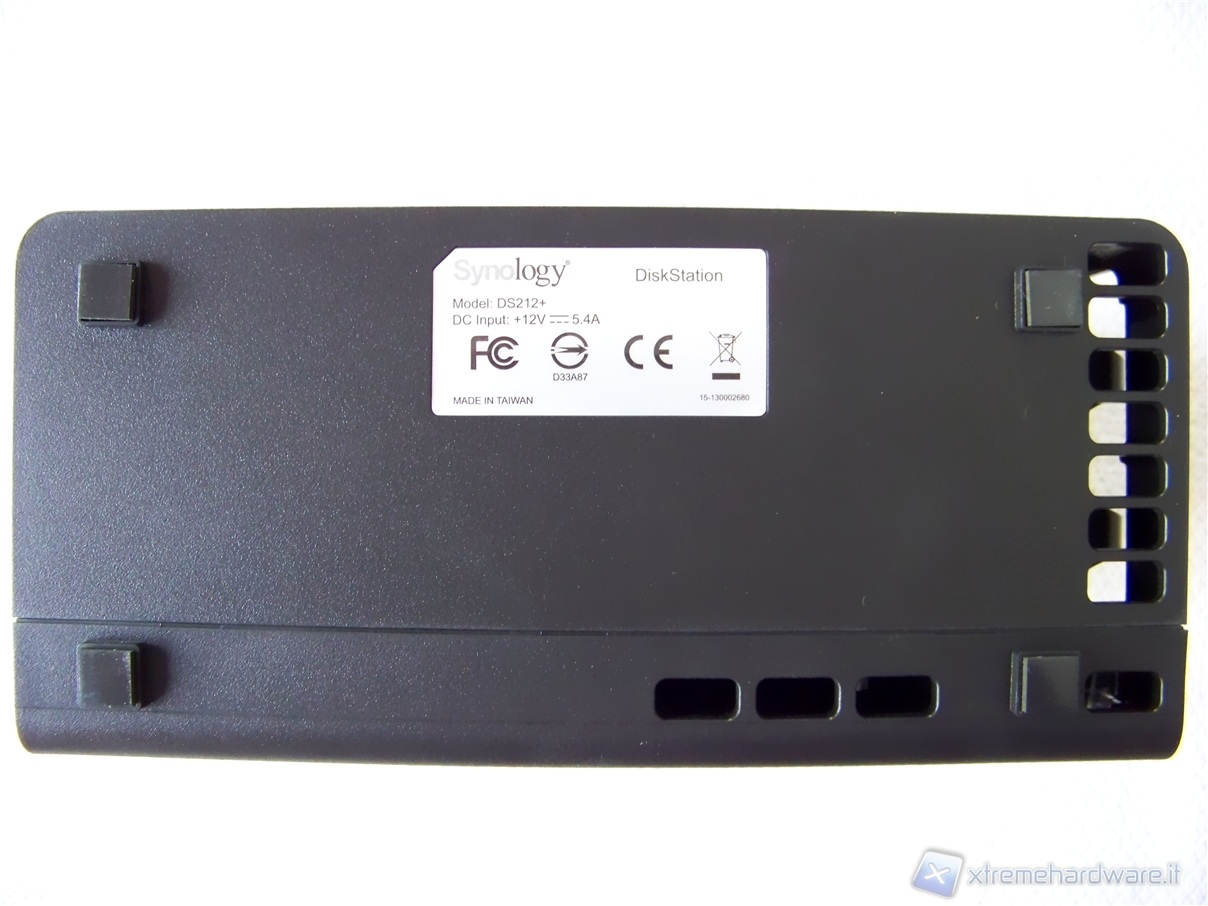 Il fondo del nostro DiskStation DS212+ è caratterizzato da alcune prese d’aria, dai classici quattro piedini in gomma antiscivolo che tengono rialzato il prodotto e dalla etichetta riportante il logo del produttore e le informazioni riguardanti il modello e l’alimentazione necessaria al funzionamento del NAS stesso.