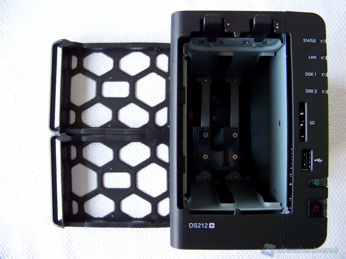 Se rimuoviamo il frontale del Synology DS212+ troviamo i due bay, in plastica nera, facilmente rimovibili ove installare i nostri due hard disk.